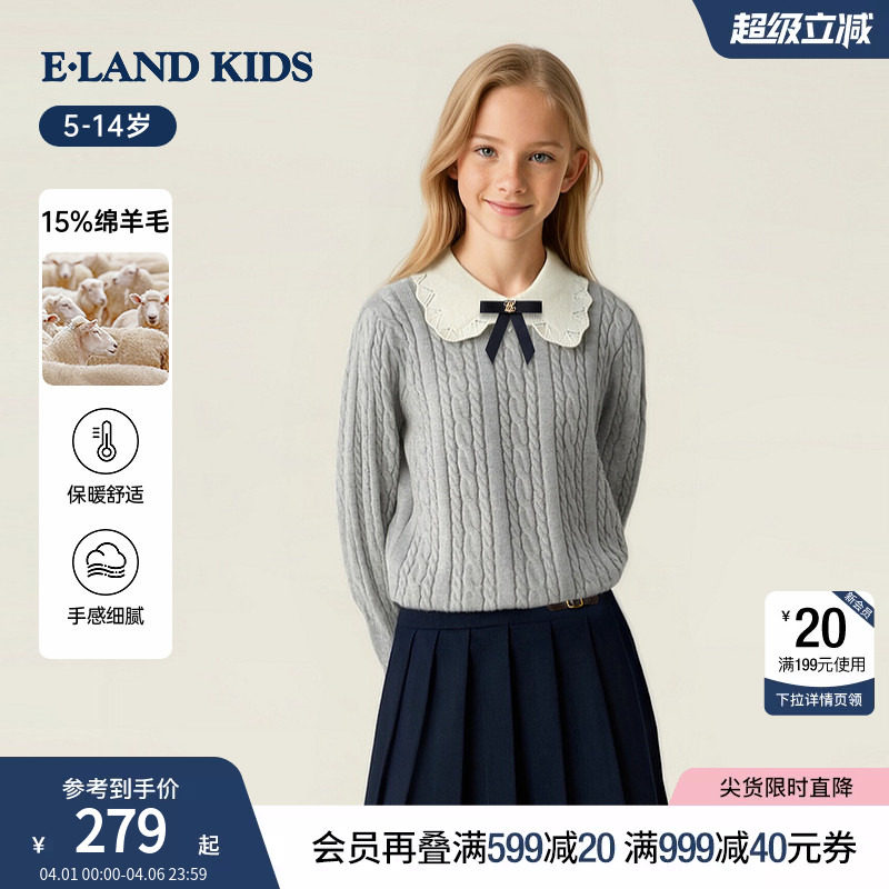 【含绵羊毛】eland kids衣恋童装女童针织衫秋冬季娃娃领绞花毛衣