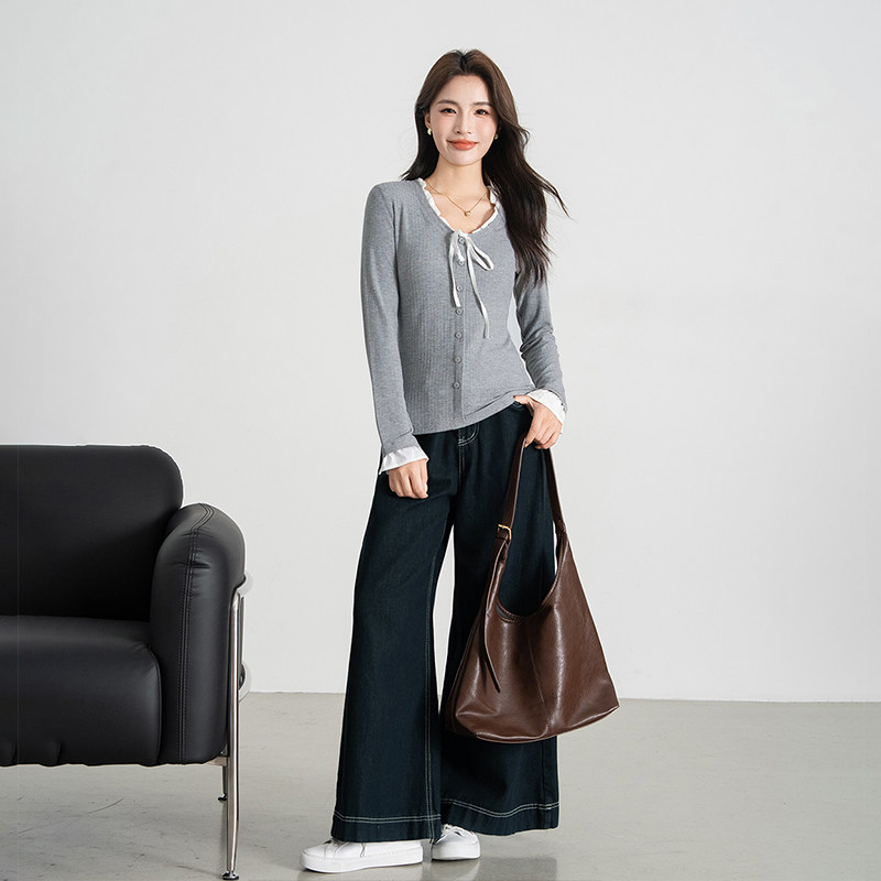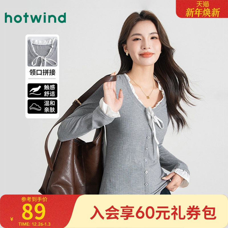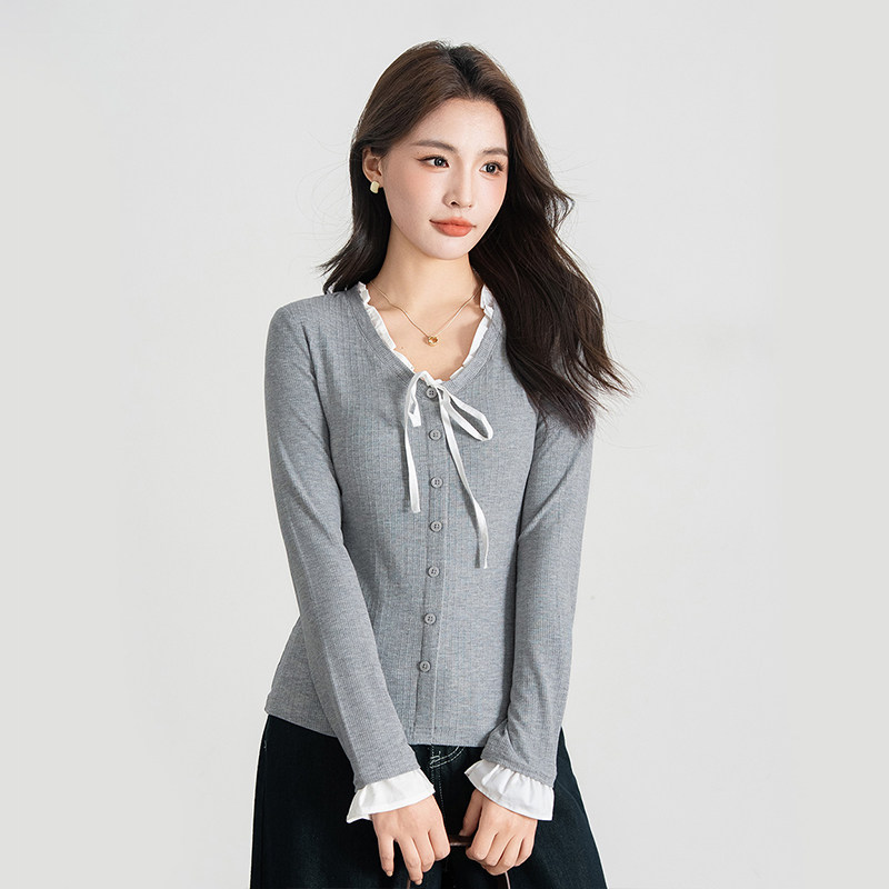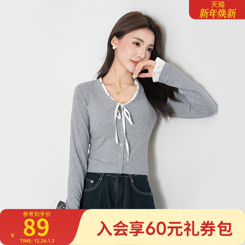 热风女士甜美蕾丝假两件学院风修身针织打底衫秋季韩系千金风内搭