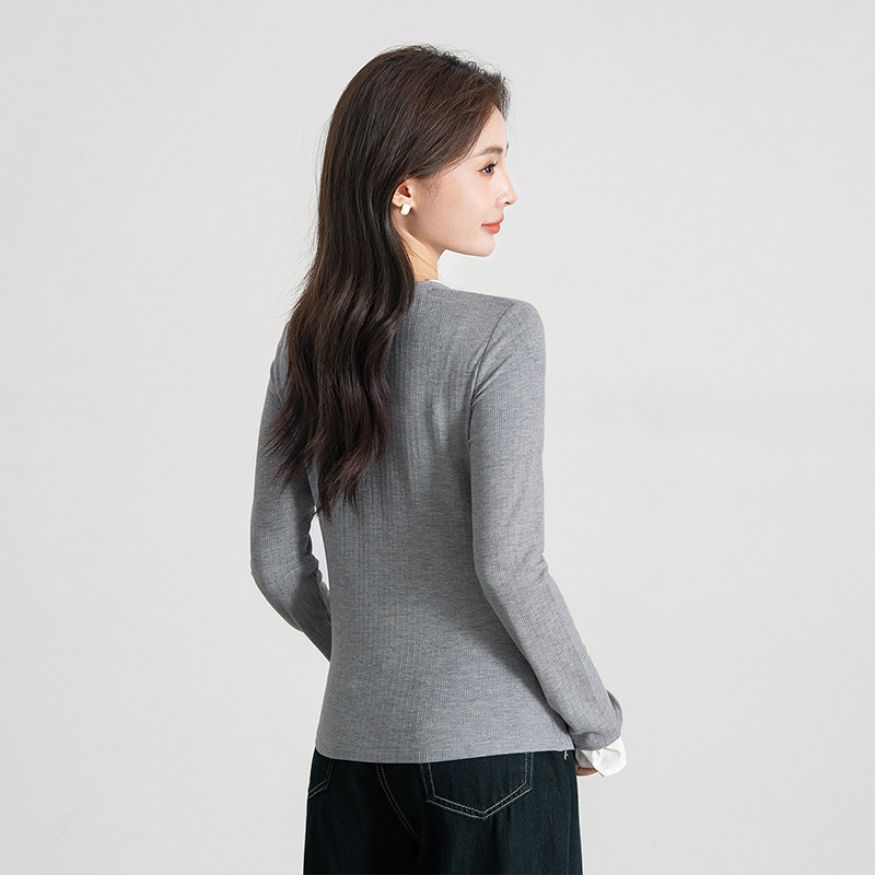 三福打底衫女2025新款秋季简约纯色收腰V领修身休闲长袖上衣女装