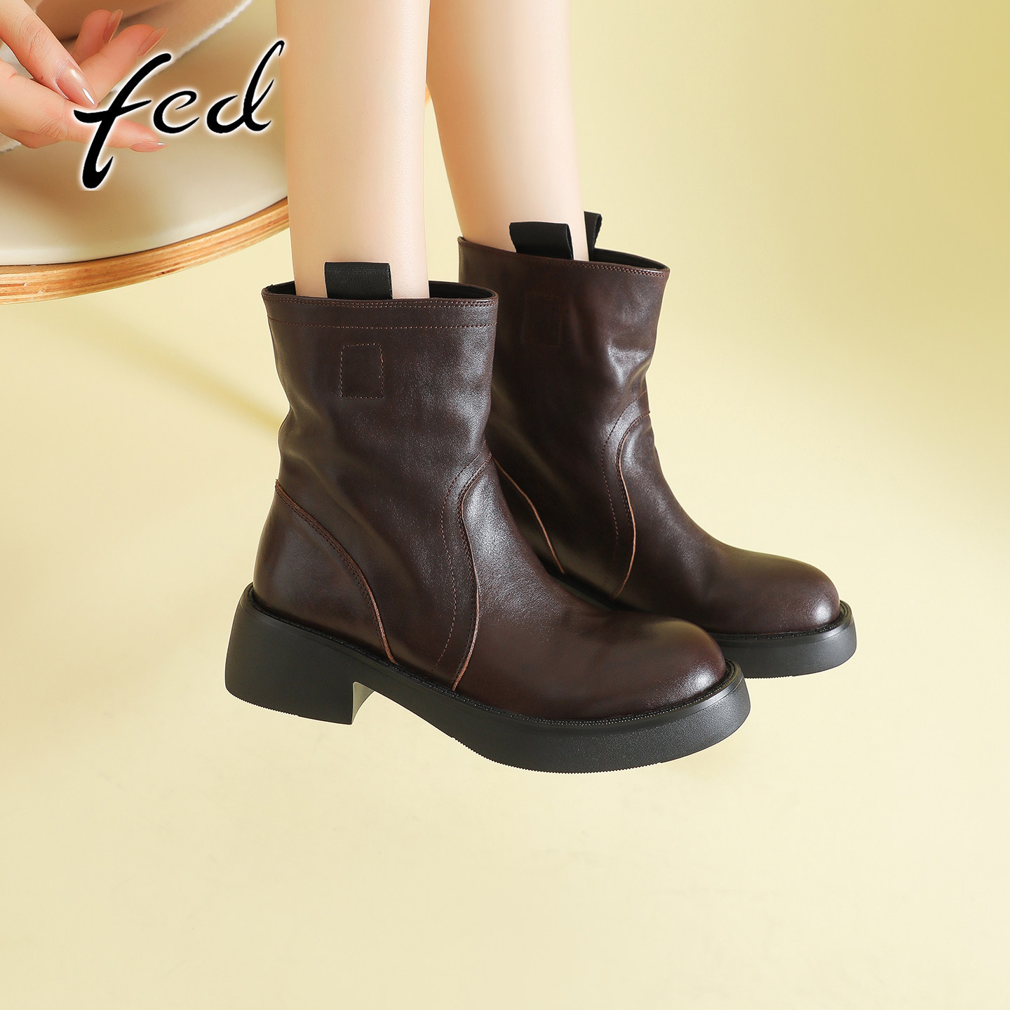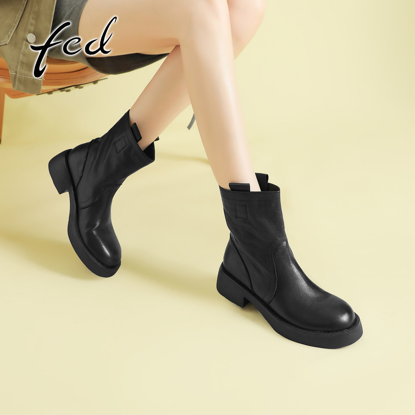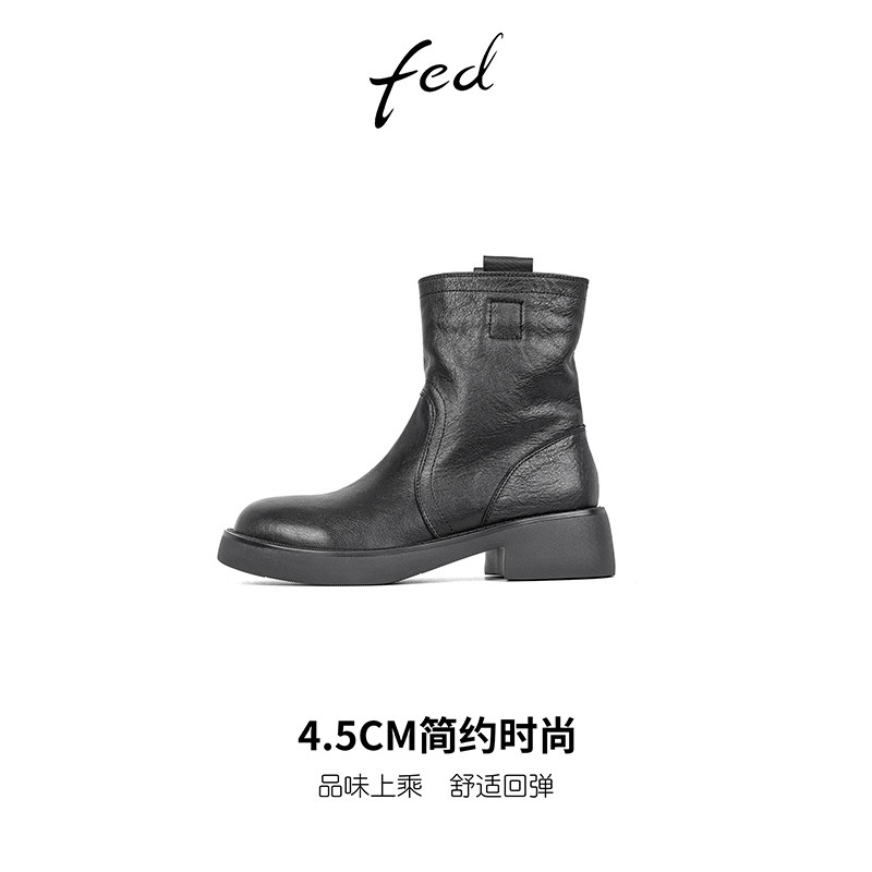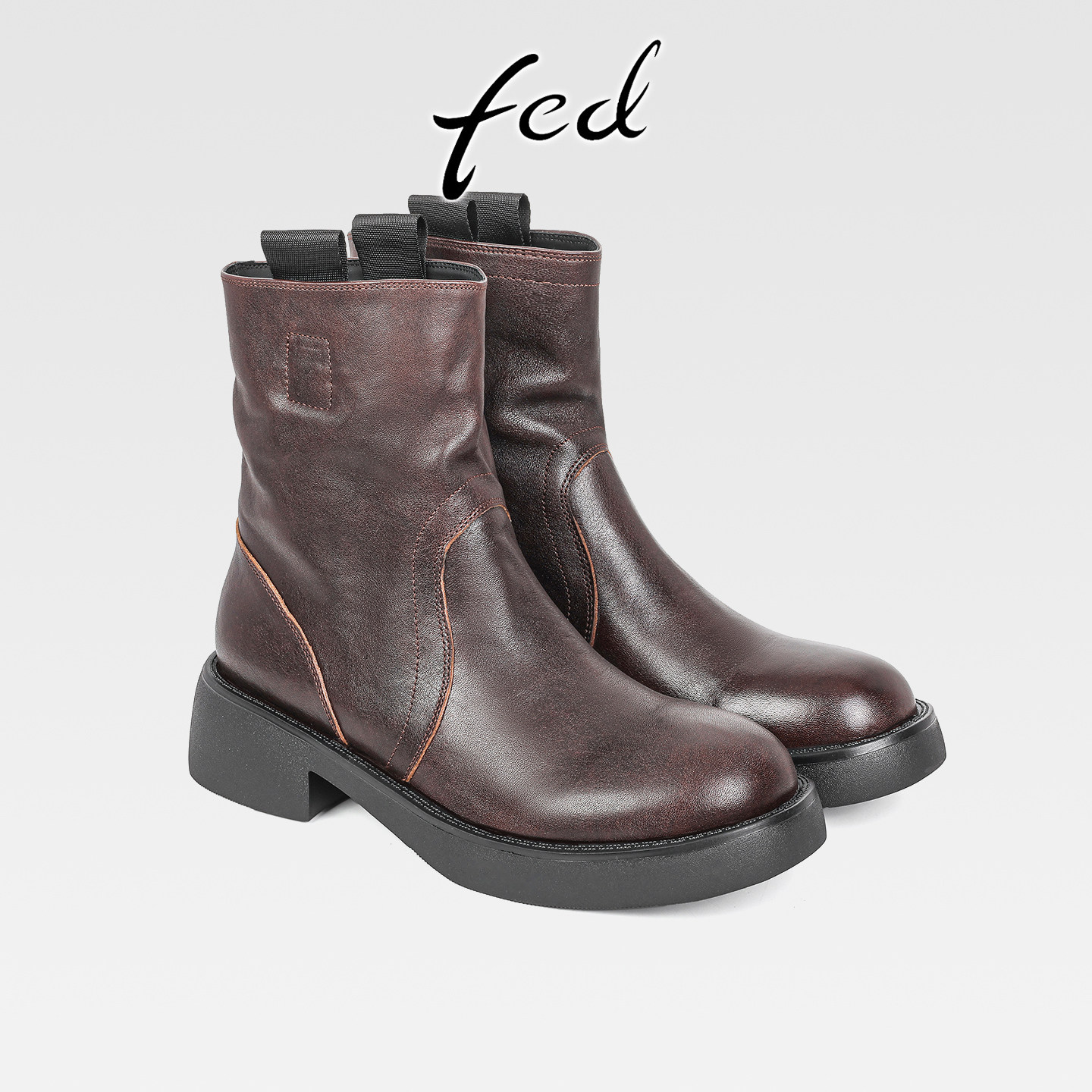 fed复古真皮粗跟厚底切尔西短靴女秋冬款百搭中跟圆头显瘦马丁靴