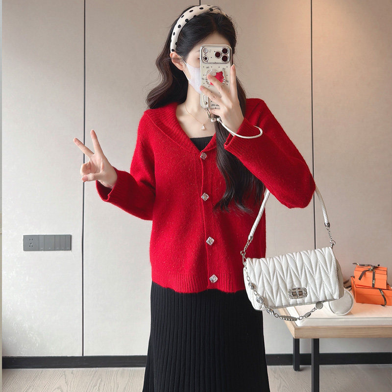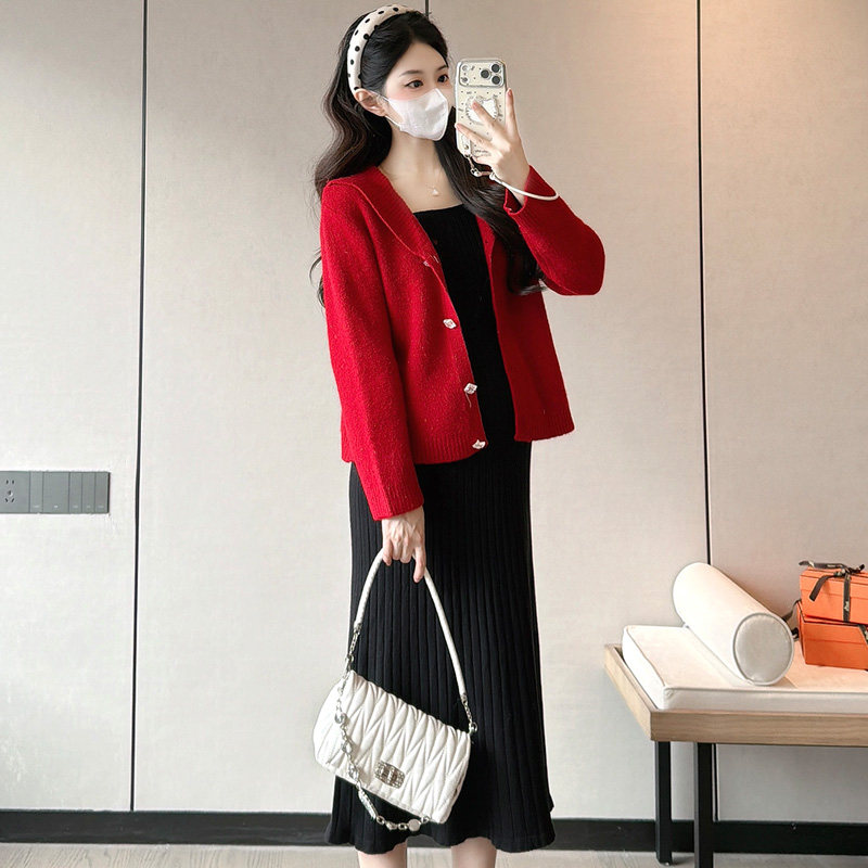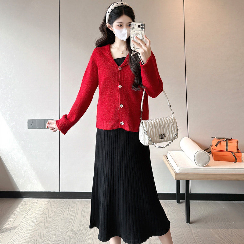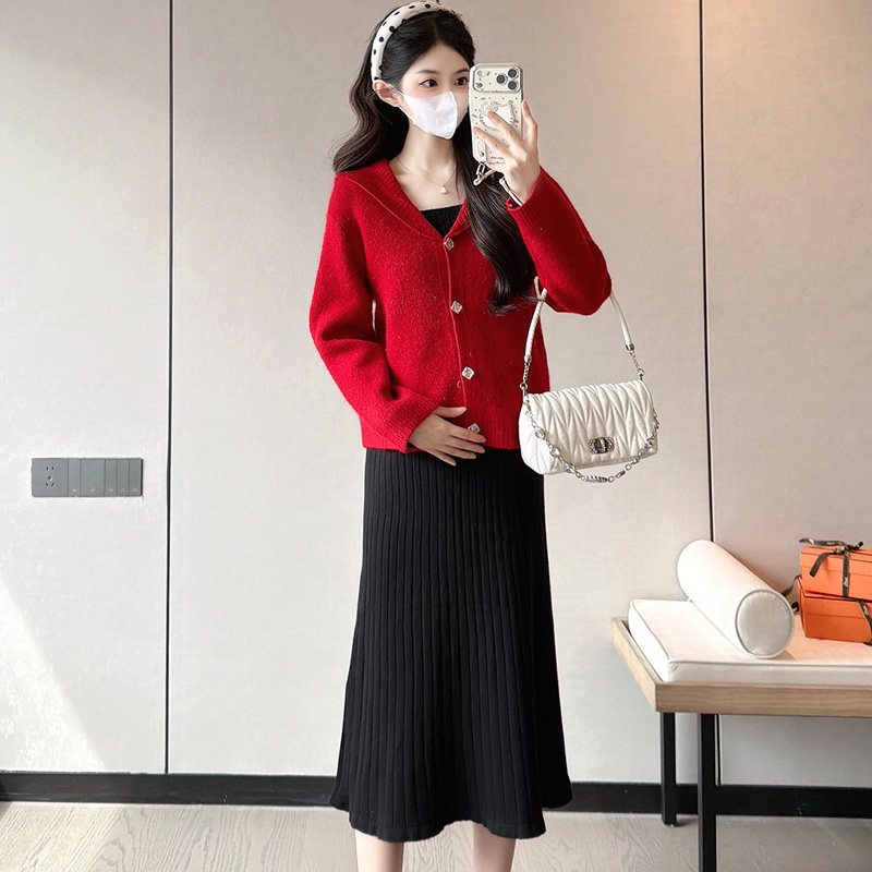 婧麒孕妇装孕妇连衣裙洋气孕期新款针织毛衣开衫红色孕妇裙子冬装