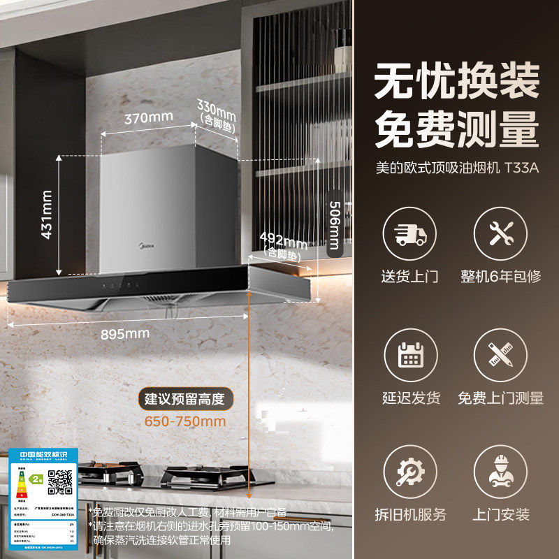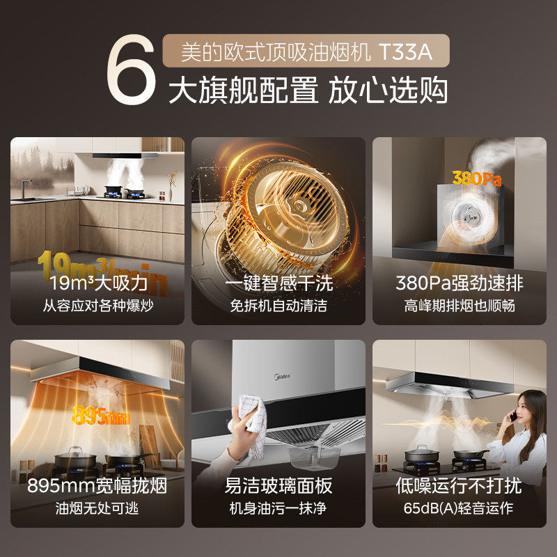 美的官方欧式抽油烟机T33A家用厨房大吸力顶吸脱排智控自清洗一级