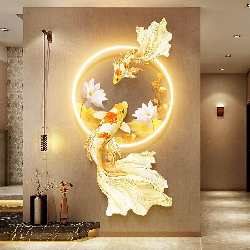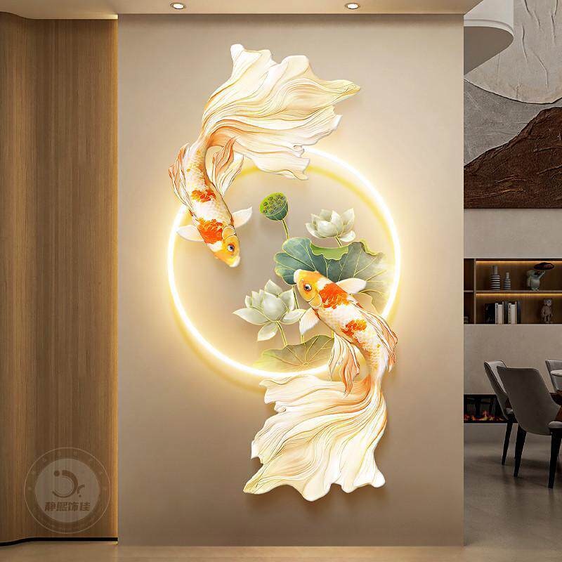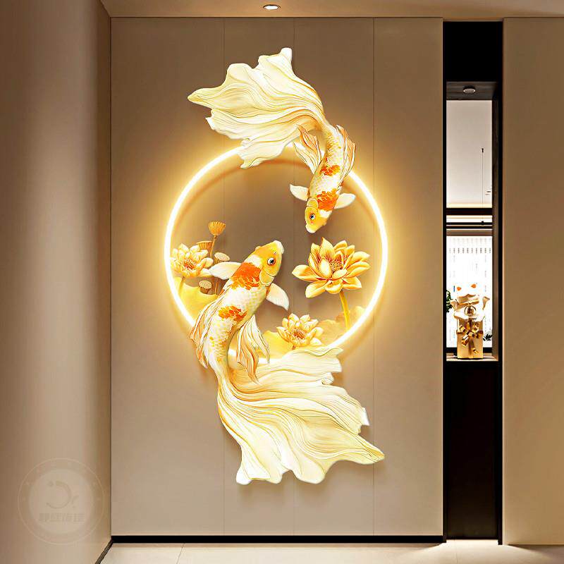 荷花图玄关装饰画锦鲤走廊带灯挂画轻奢年年有余入户发光壁饰