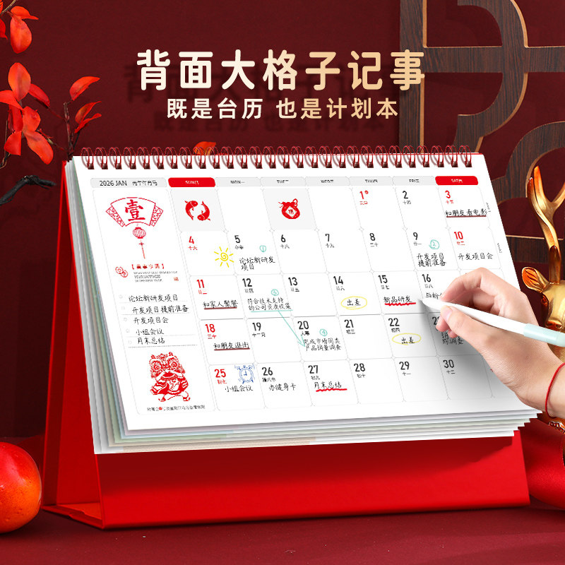 2026年台历新款镂空记事大格子日历创意农历年历广告台历定制红色喜庆计划本打卡月历商务办公台历定制LOGO