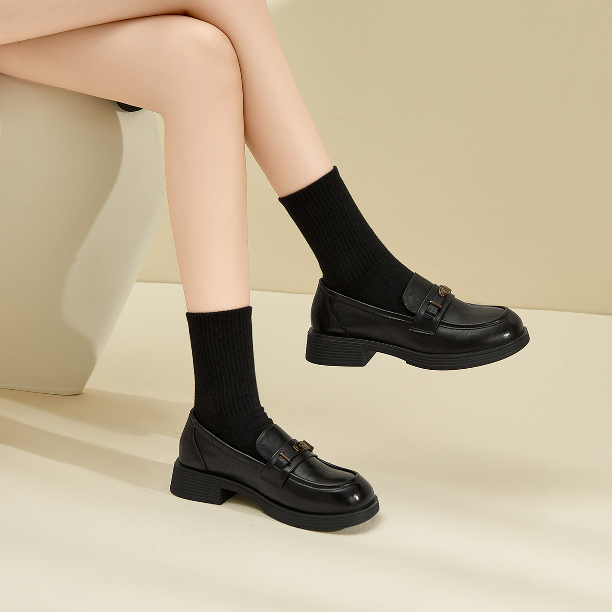 戈美其乐福鞋女2025秋冬季新款一脚蹬单鞋英伦风软底黑色小皮鞋子
