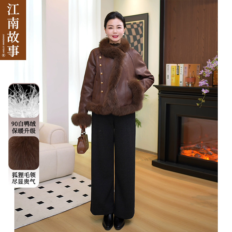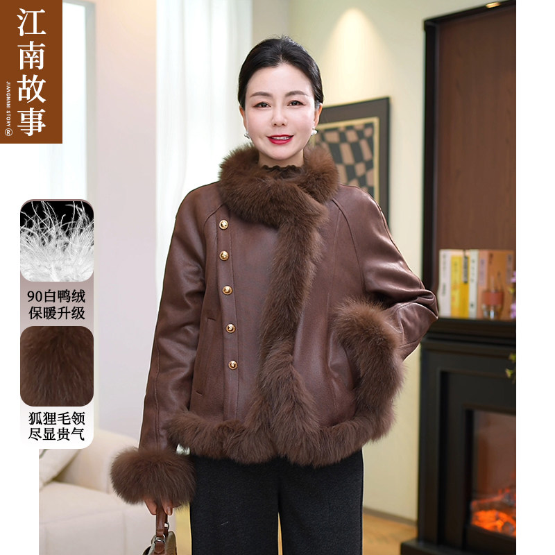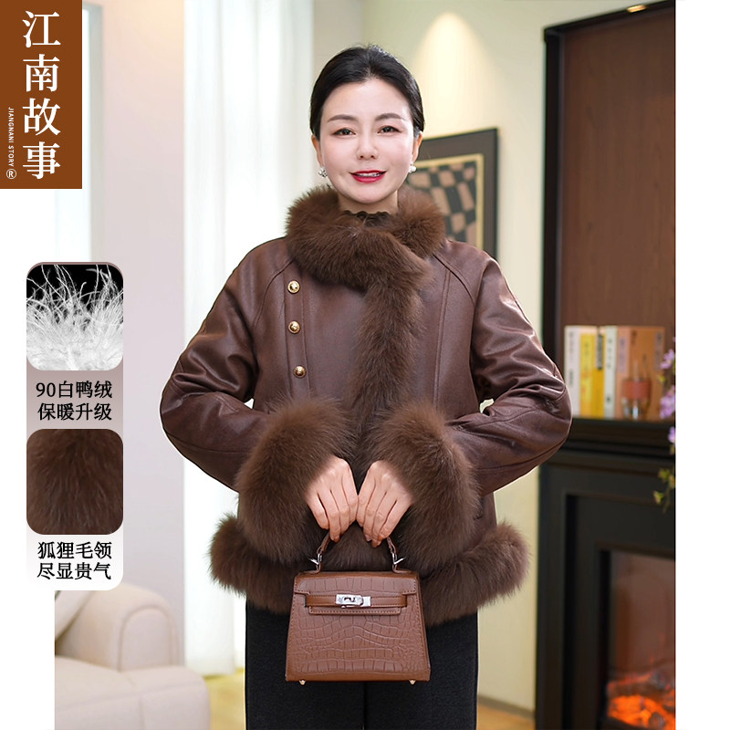 江南故事妈妈装2025新款秋冬皮草外套女短款狐狸毛领羽绒服