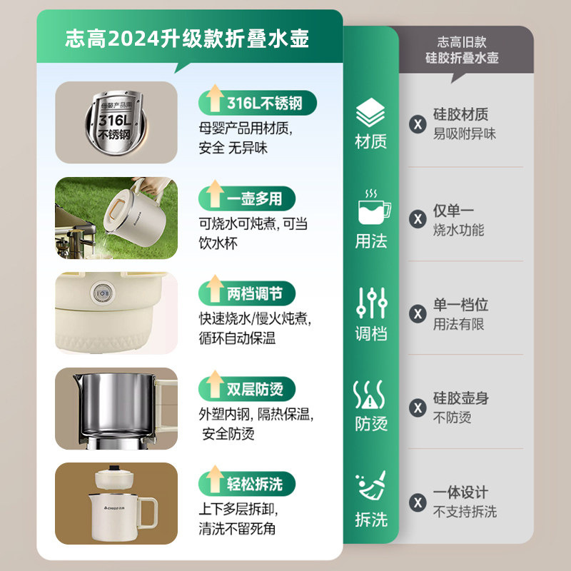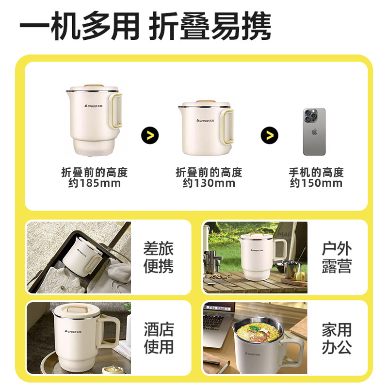志高折叠烧水壶800ml便携式304不锈钢旅行电热水壶电水壶保温煮水