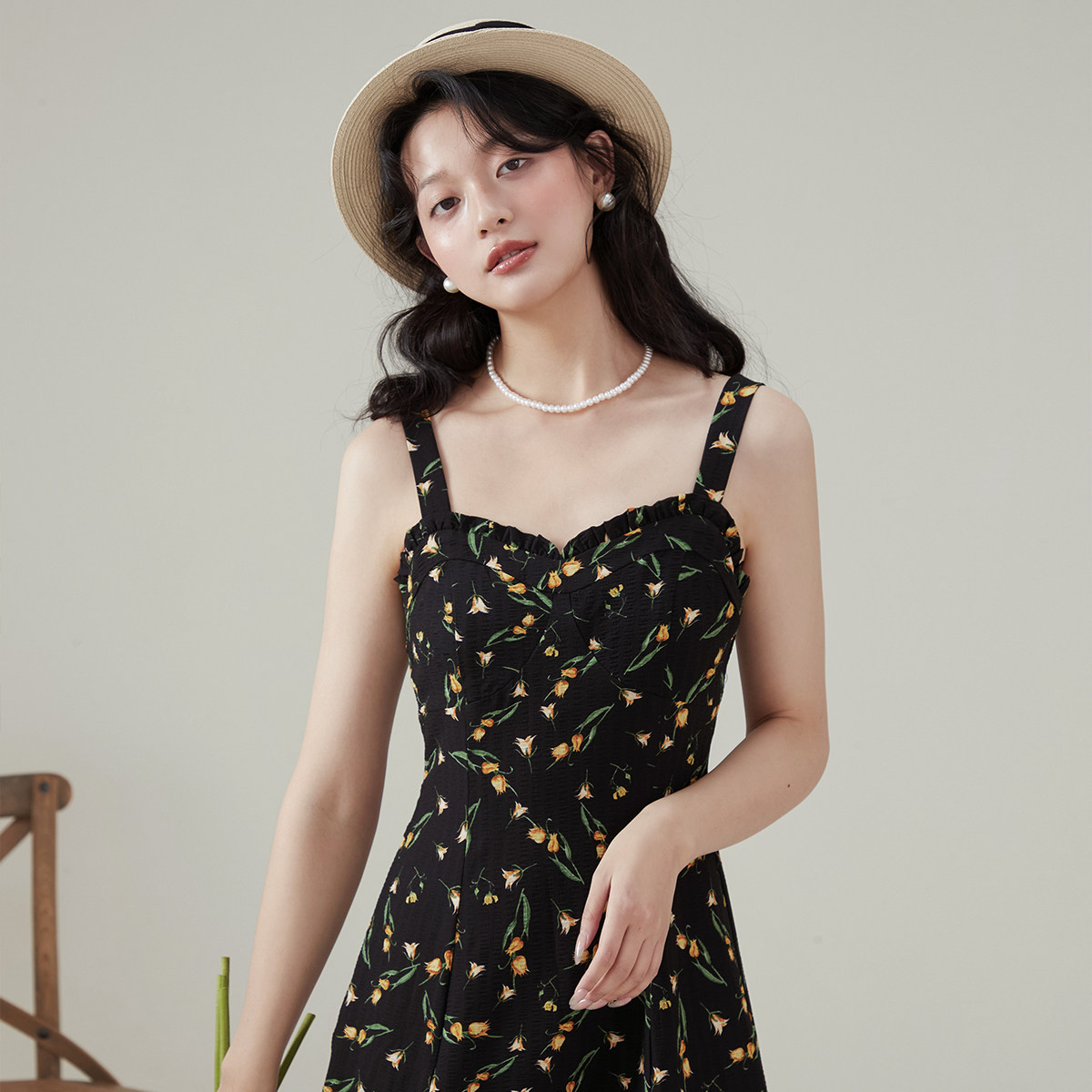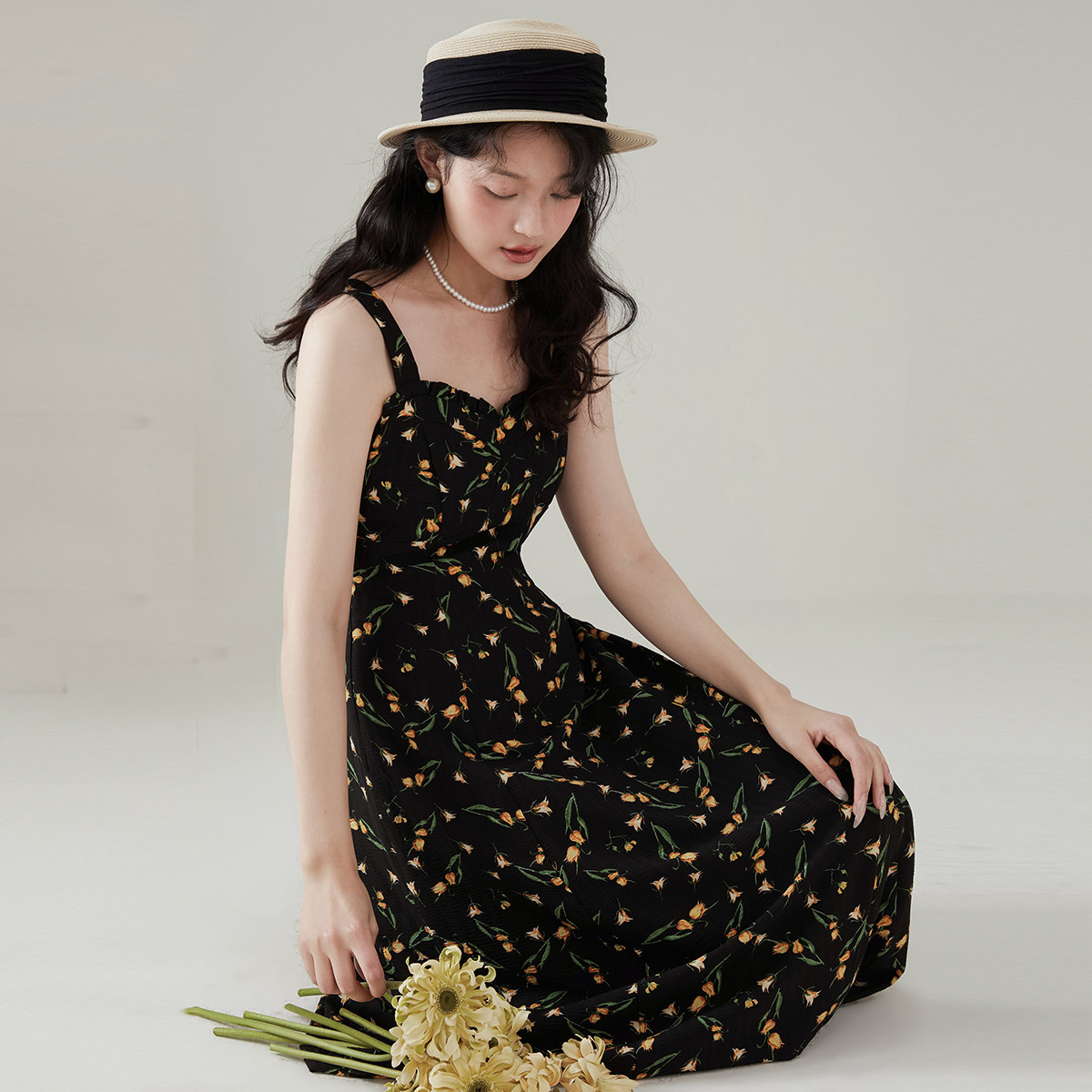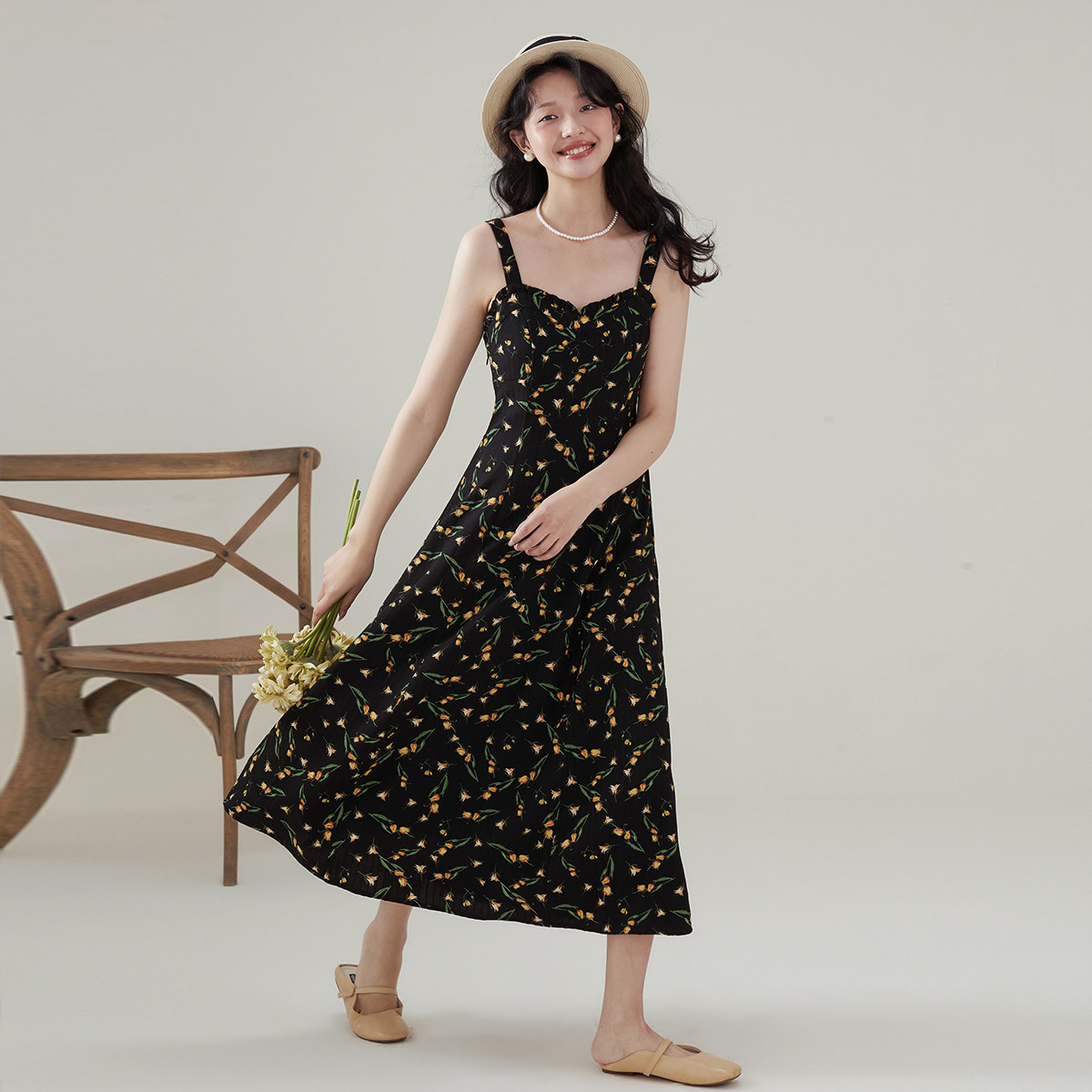one more2025夏季新款a字法式碎花吊带连衣裙女气质雪纺裙子修身