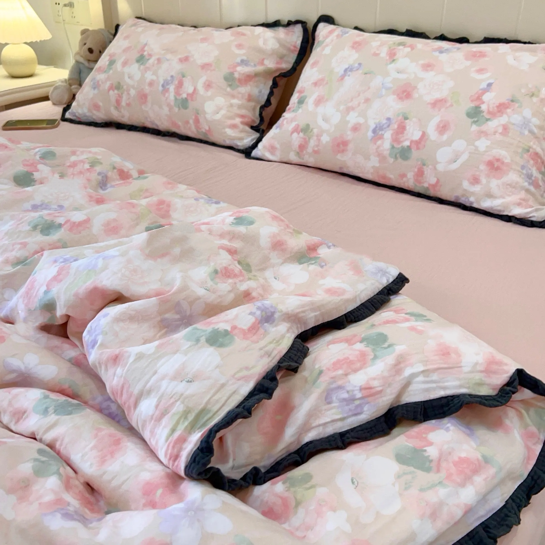 新美拉德色系A类全棉双层纱四件套皱皱花边纯棉柔软亲肤床笠被套