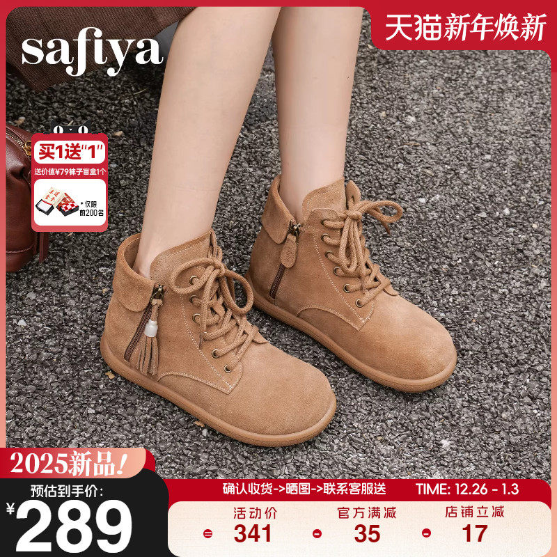 Safiya/索菲娅2025冬季新品游牧风流苏侧拉链系带平底靴子短靴
