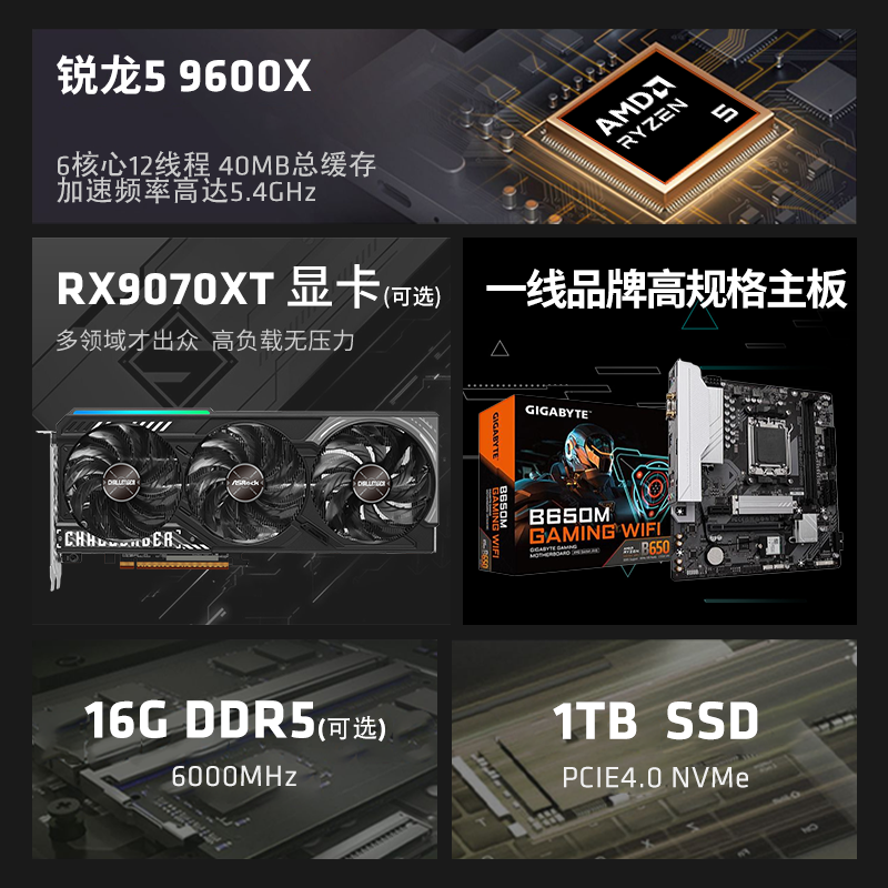 AMD锐龙R5 9600X/RX7650GRE/RTX5060/RX9070XT电竞游戏主机DIY整机直播网游打瓦吃鸡电脑台式机电脑组装机