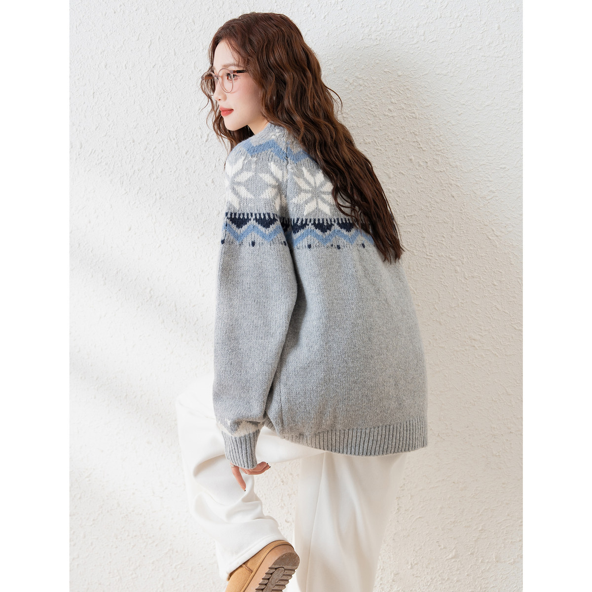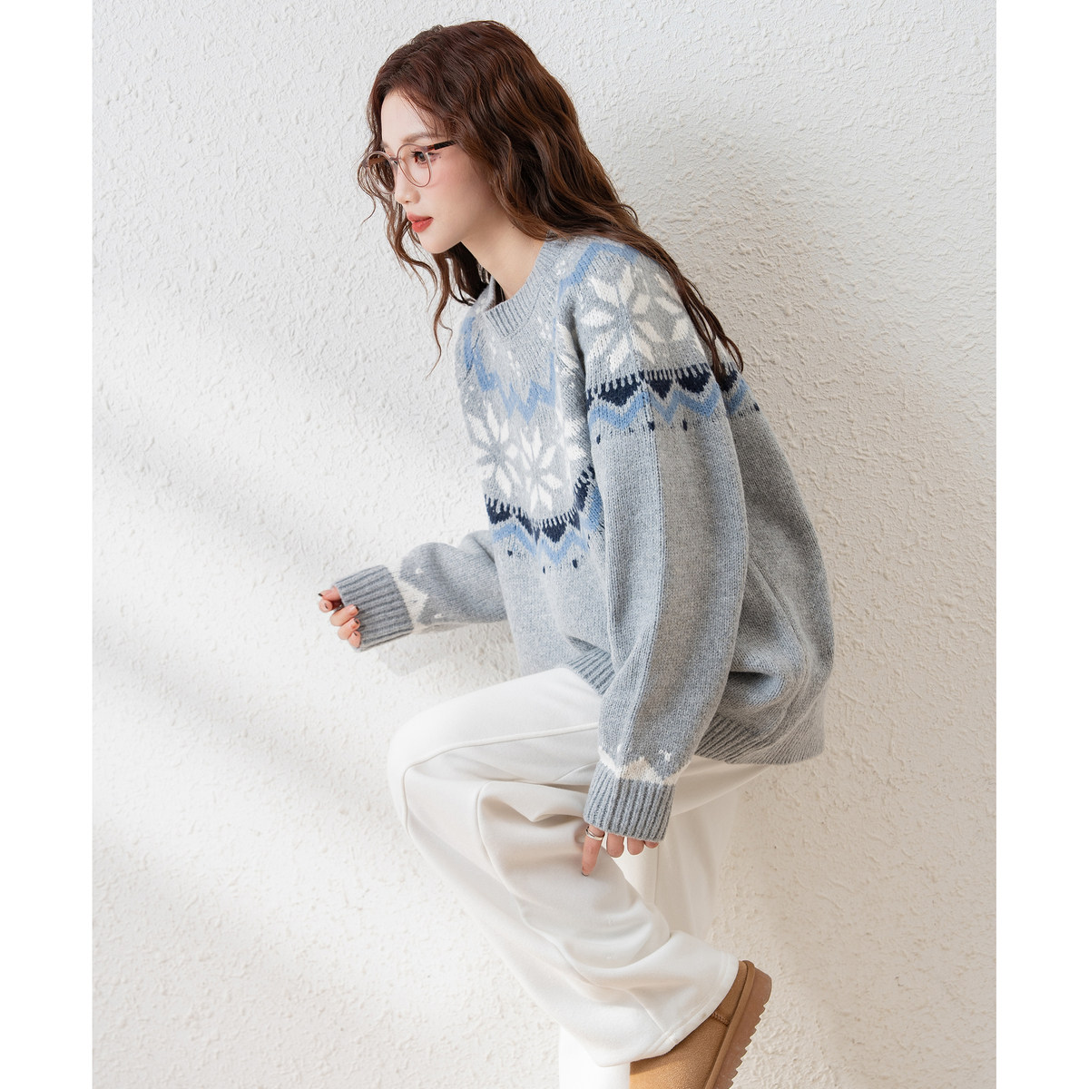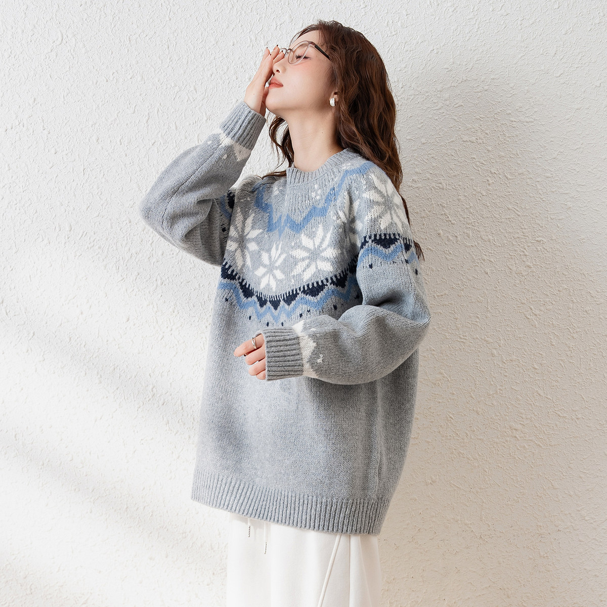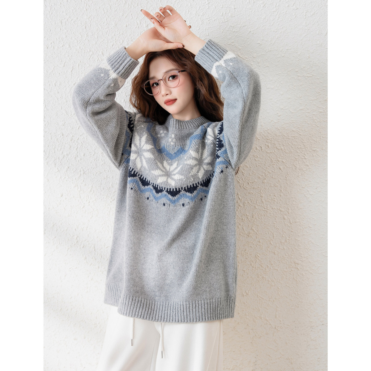 唐狮秋冬女圆领民族风套头毛线衫设计感小众白色费尔岛毛衣TD