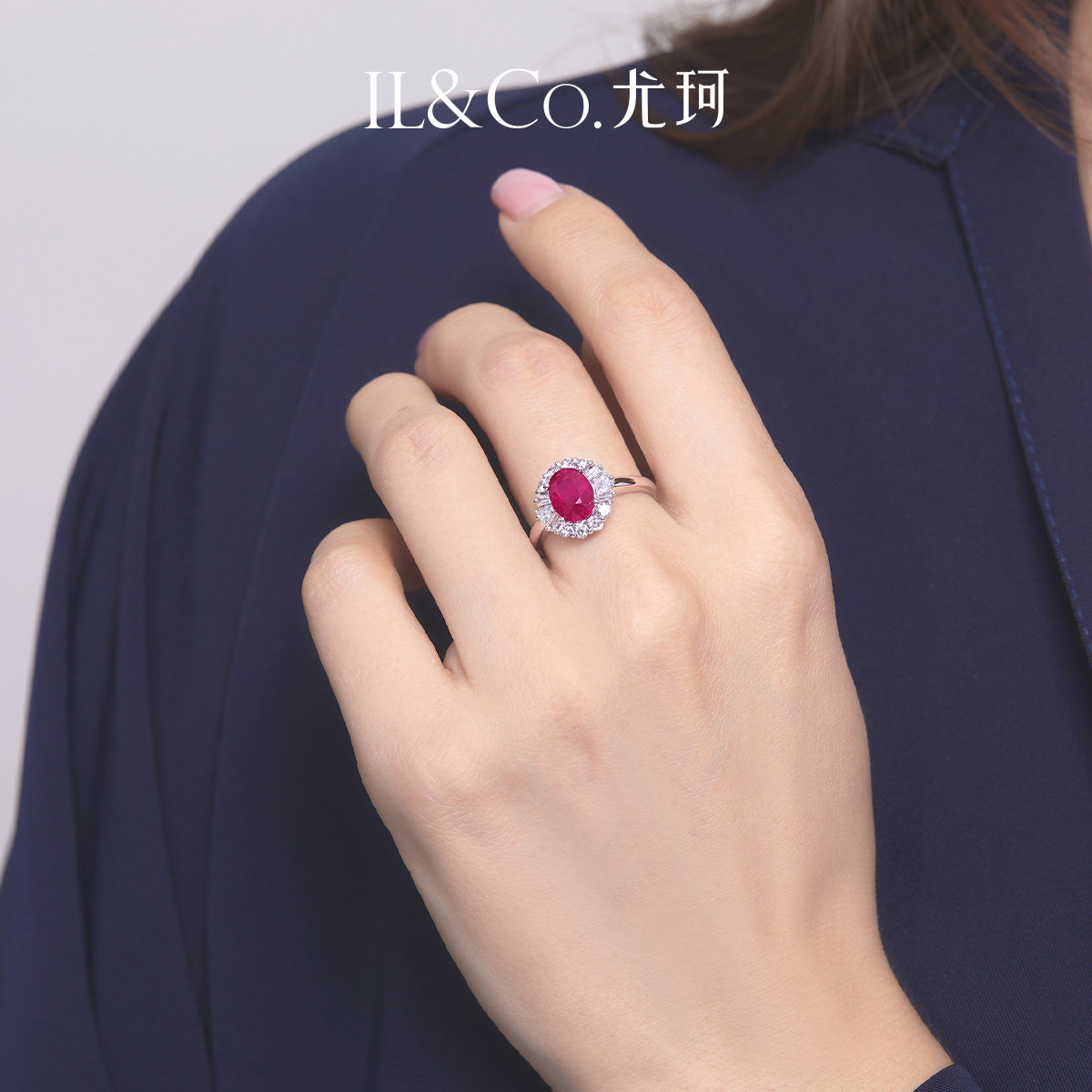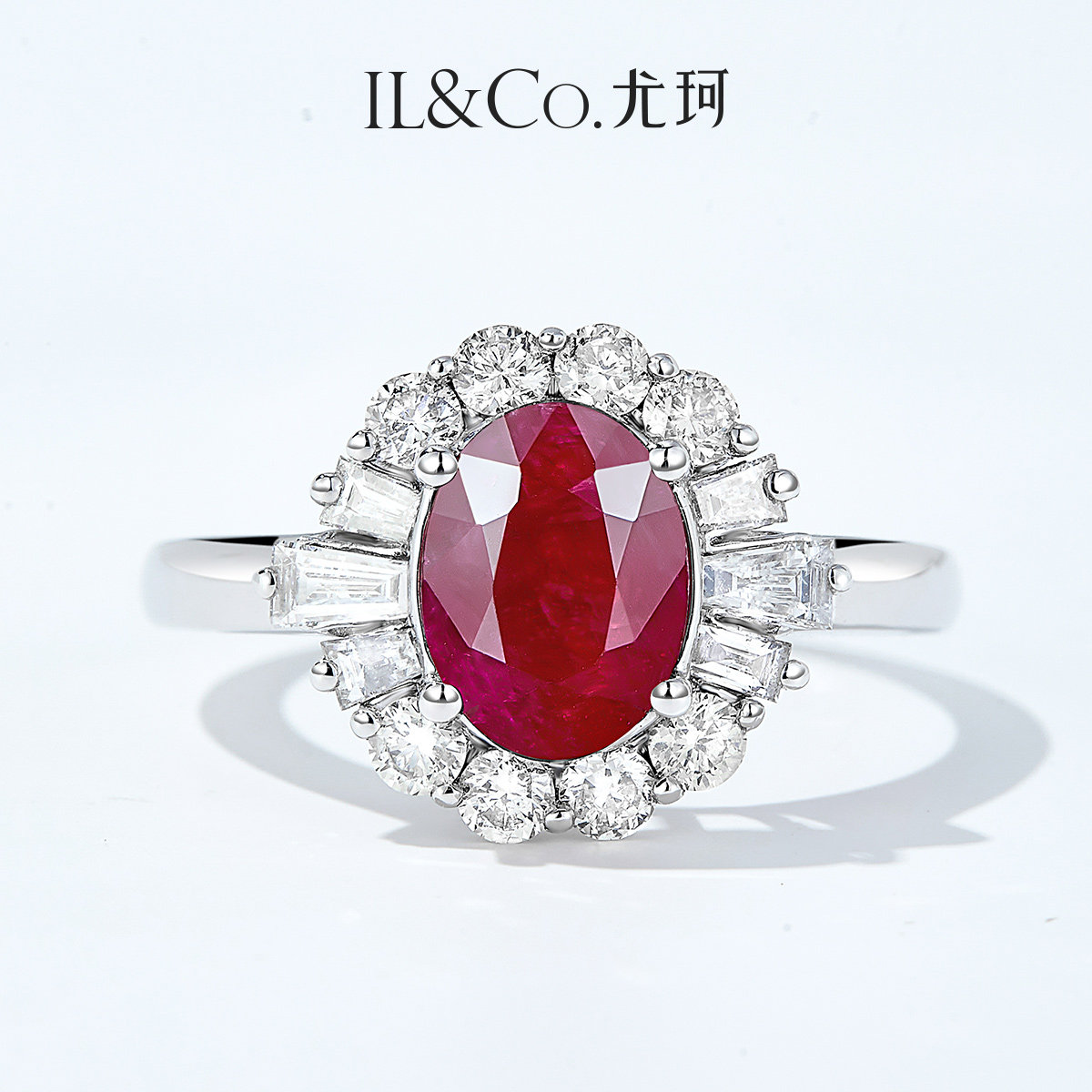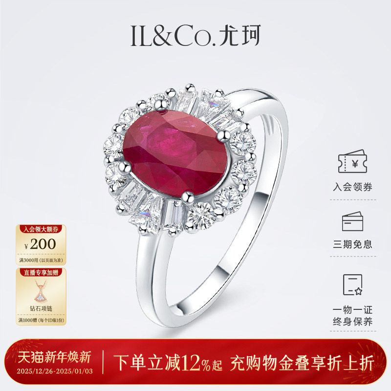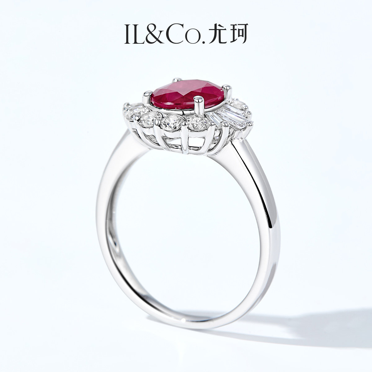 ILCO尤珂 白18K金天然红宝石钻石围镶椭圆形花朵造型设计感戒指女