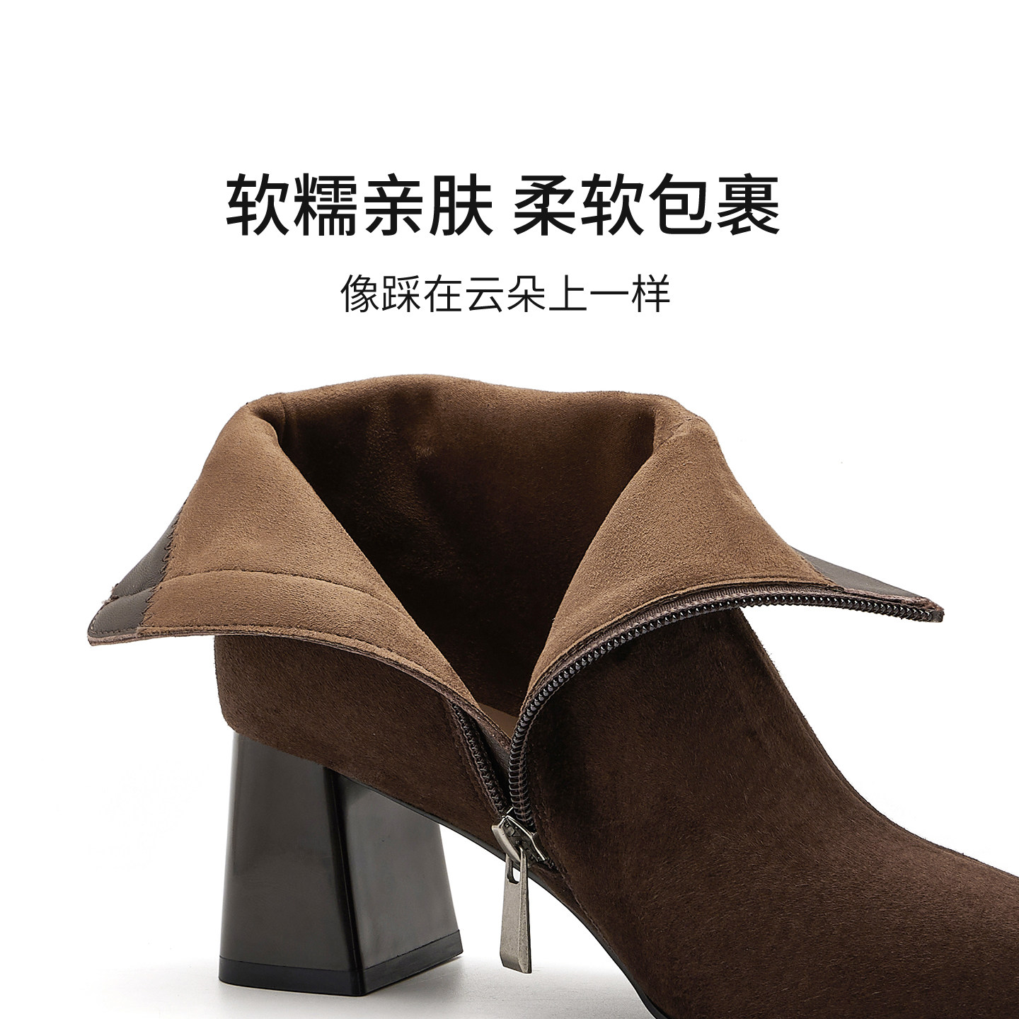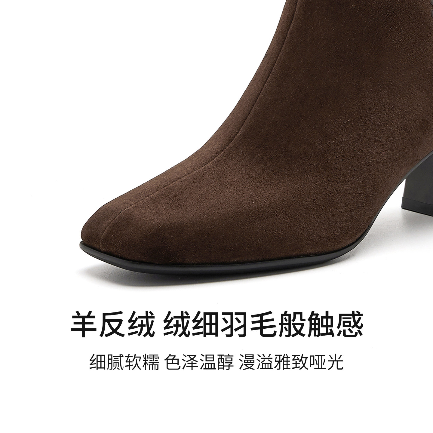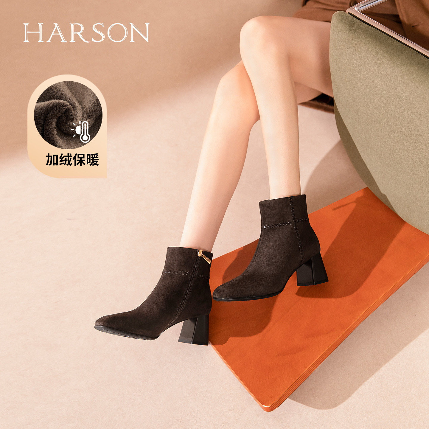 哈森羊反绒方头粗跟时装靴通勤百搭短筒靴女2025冬新款HWA250206