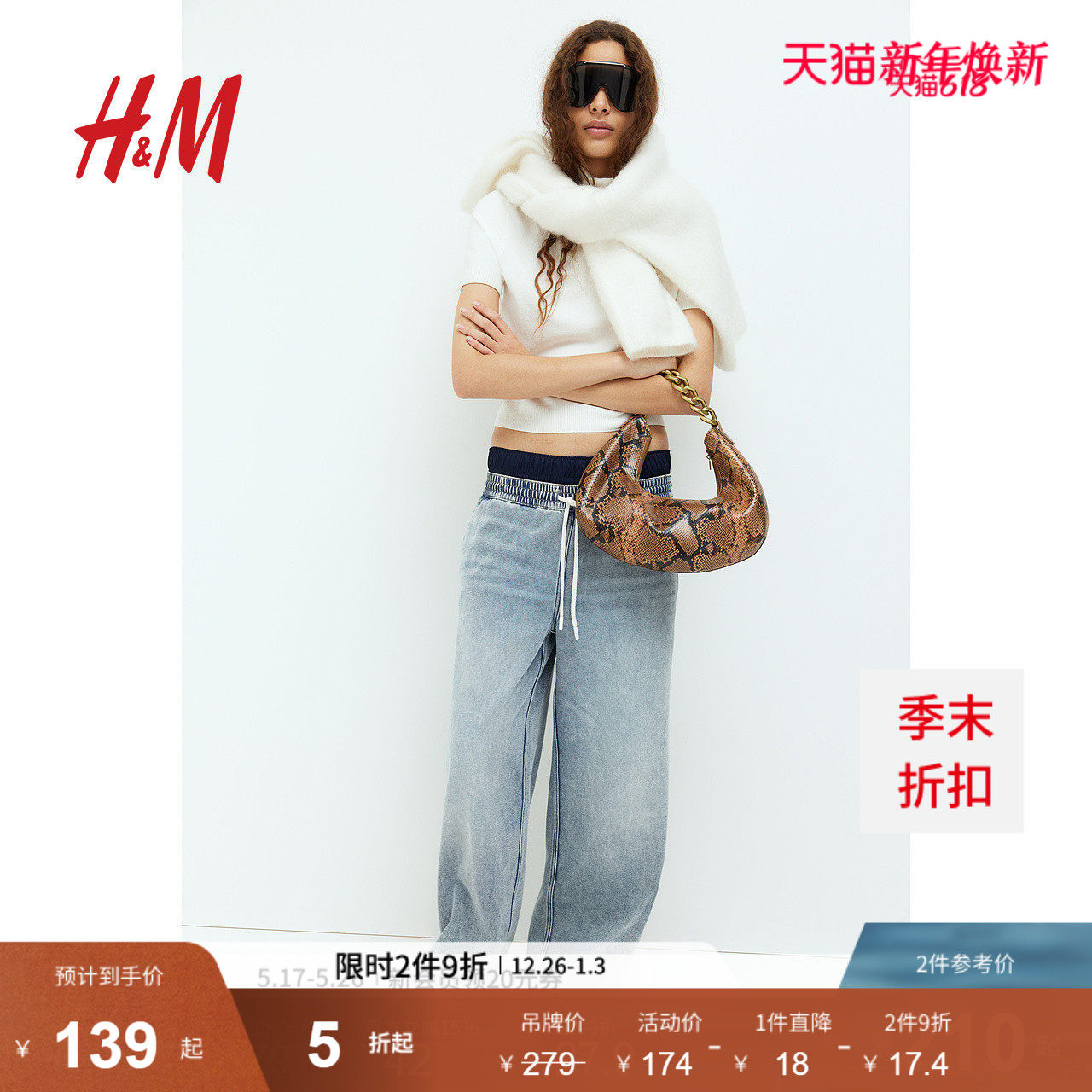 HM女装牛仔裤2025冬季新款松紧腰直筒潮流休闲牛仔长裤1237416