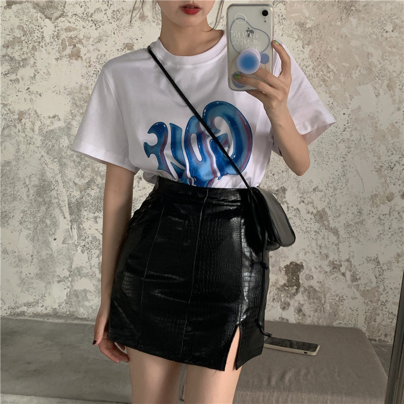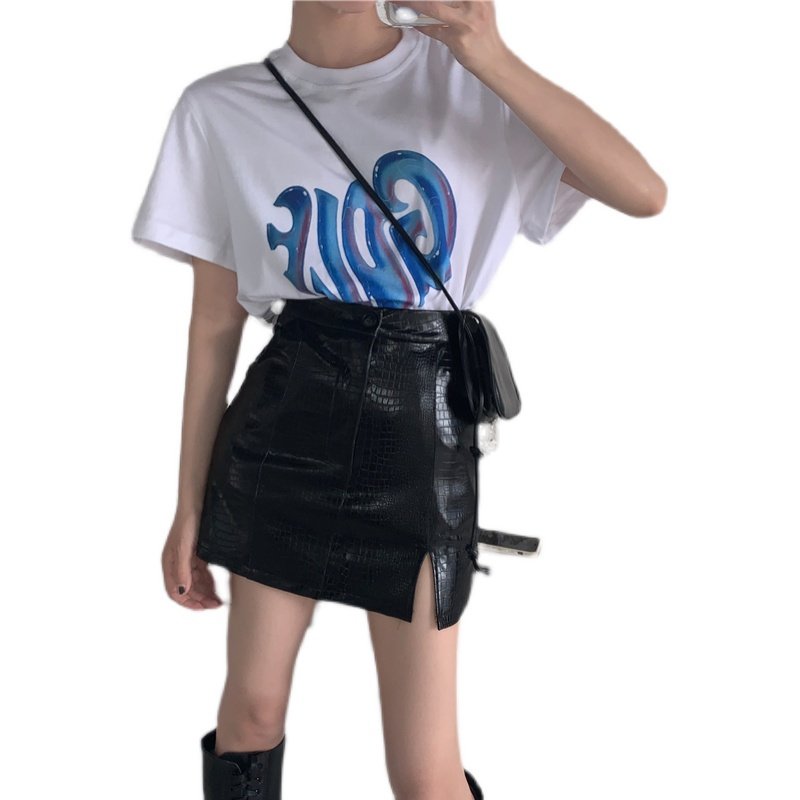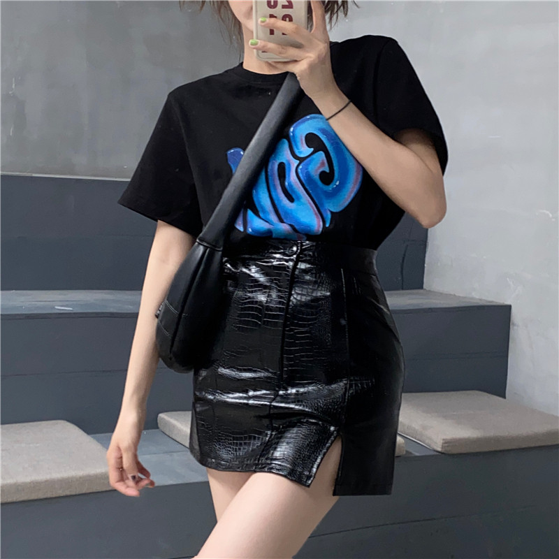 鳄鱼纹开叉皮裙半身裙a字裙秋季大码胖mm高腰包臀pu亮皮黑色短裙