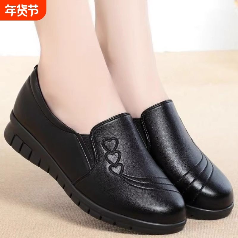 断码妈妈鞋单鞋女春秋防滑软底真皮平底舒适中老年人奶奶鞋