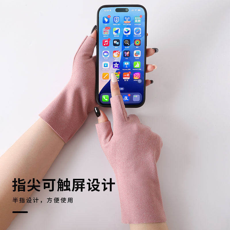 德绒半指手套女冬季半截漏手指加绒保暖防寒开车学生写字连指触屏