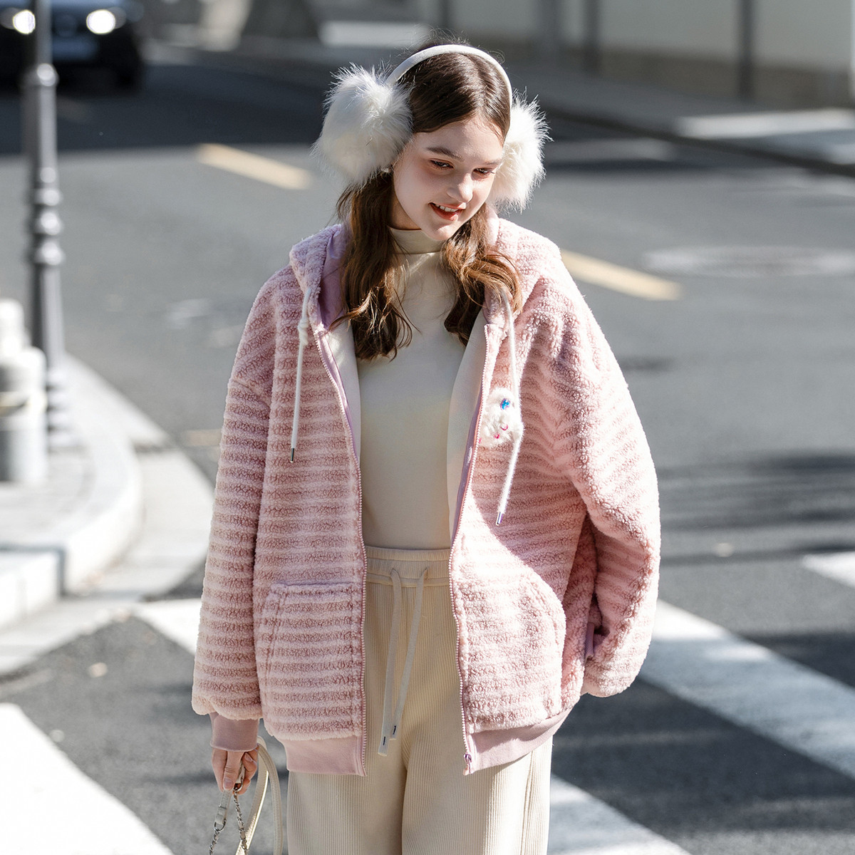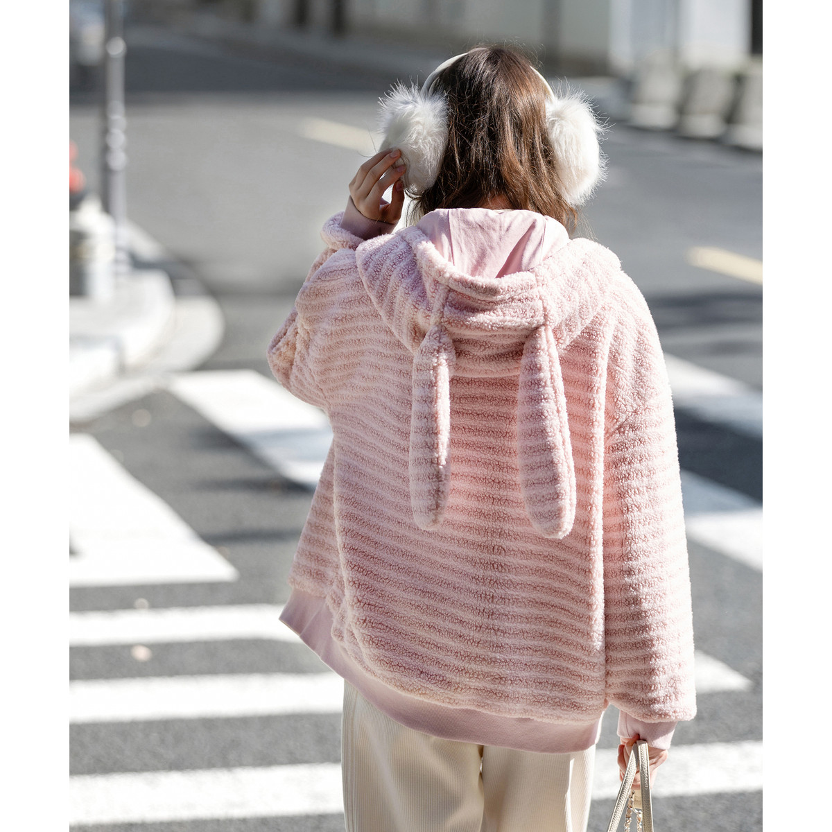 唐狮秋冬女条纹兔耳朵毛绒一手长外套可爱甜美少女风软糯TM
