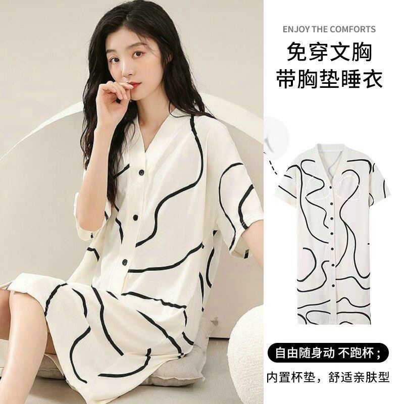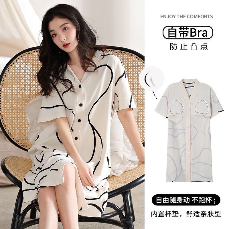 韩式甜美带胸垫睡裙女夏季短袖睡衣可爱夏宽松家居服薄款中长款