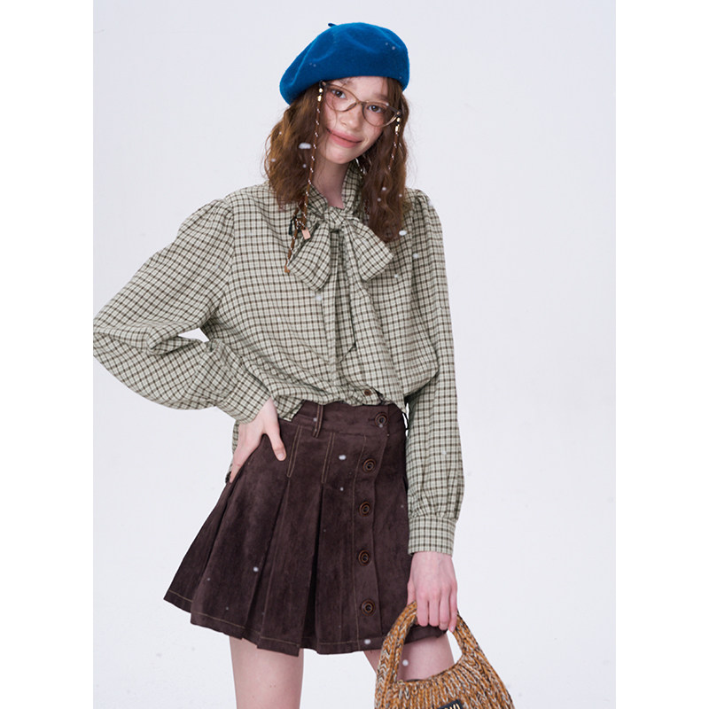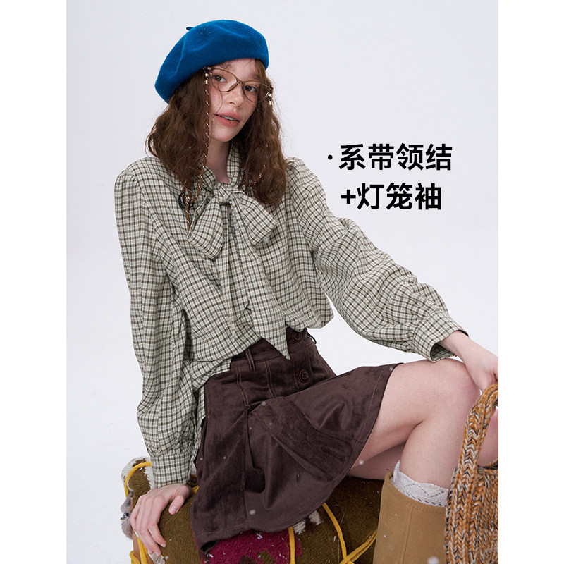 妖精的口袋系带领结灯笼袖复古格子衬衫女2025冬新款叠穿内搭衬衣