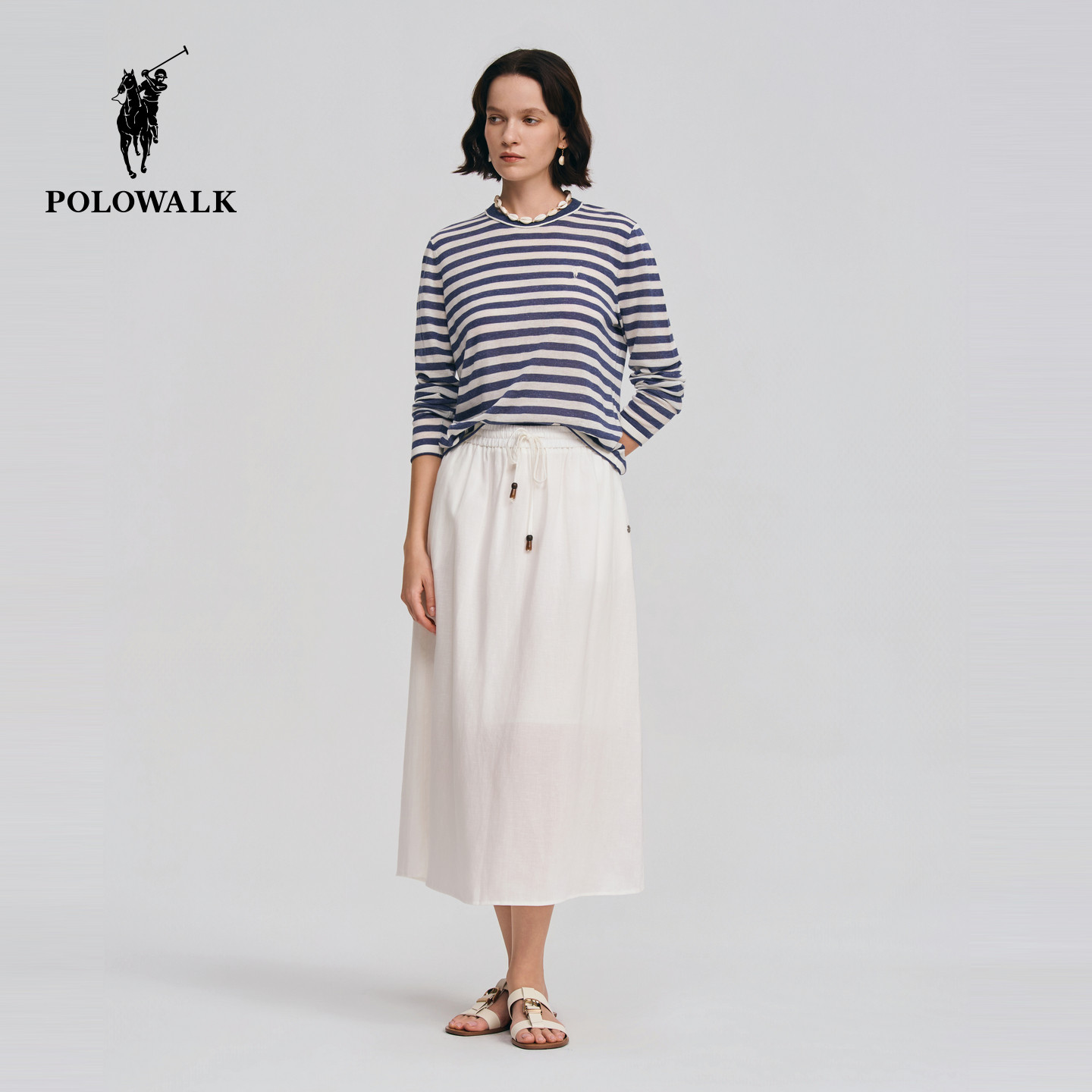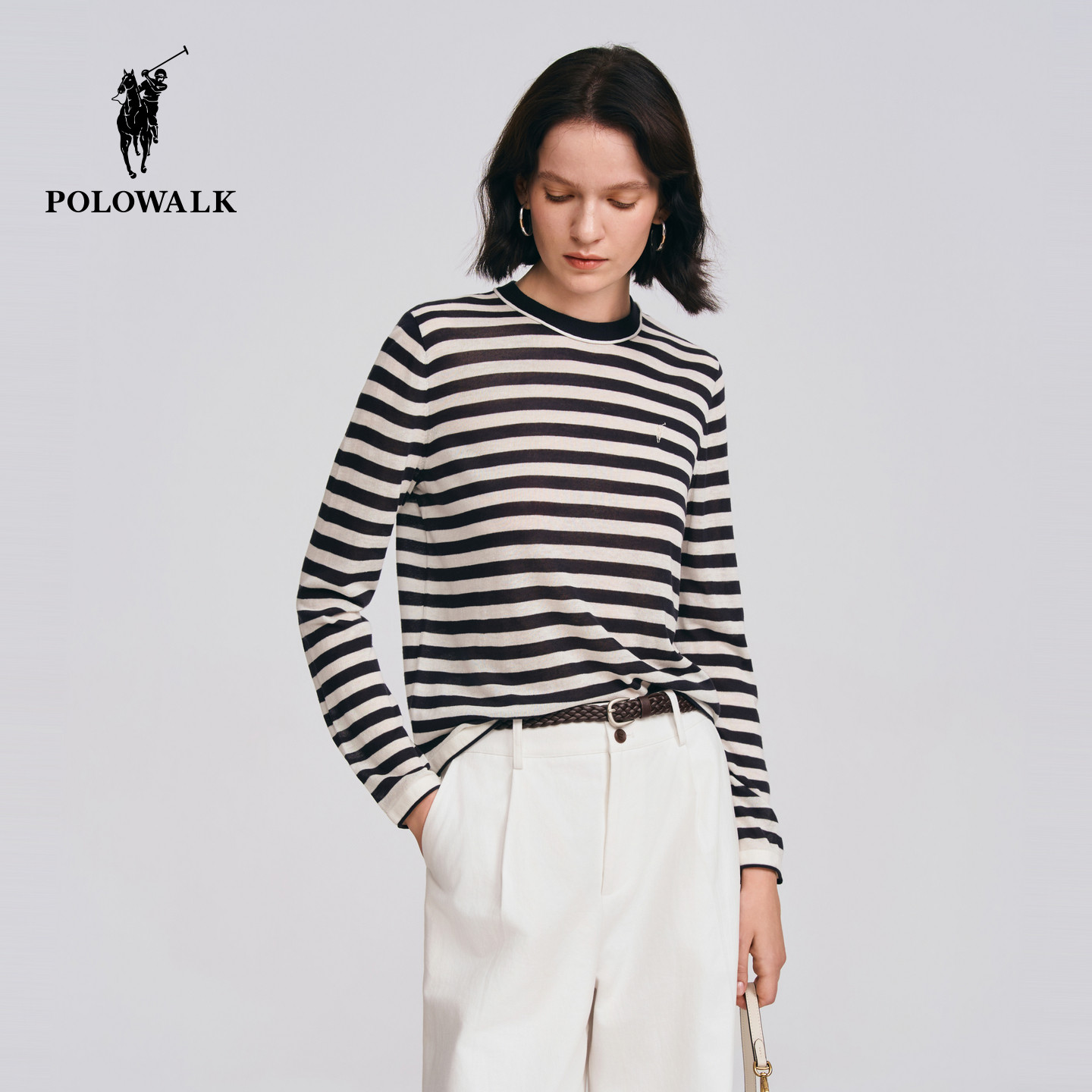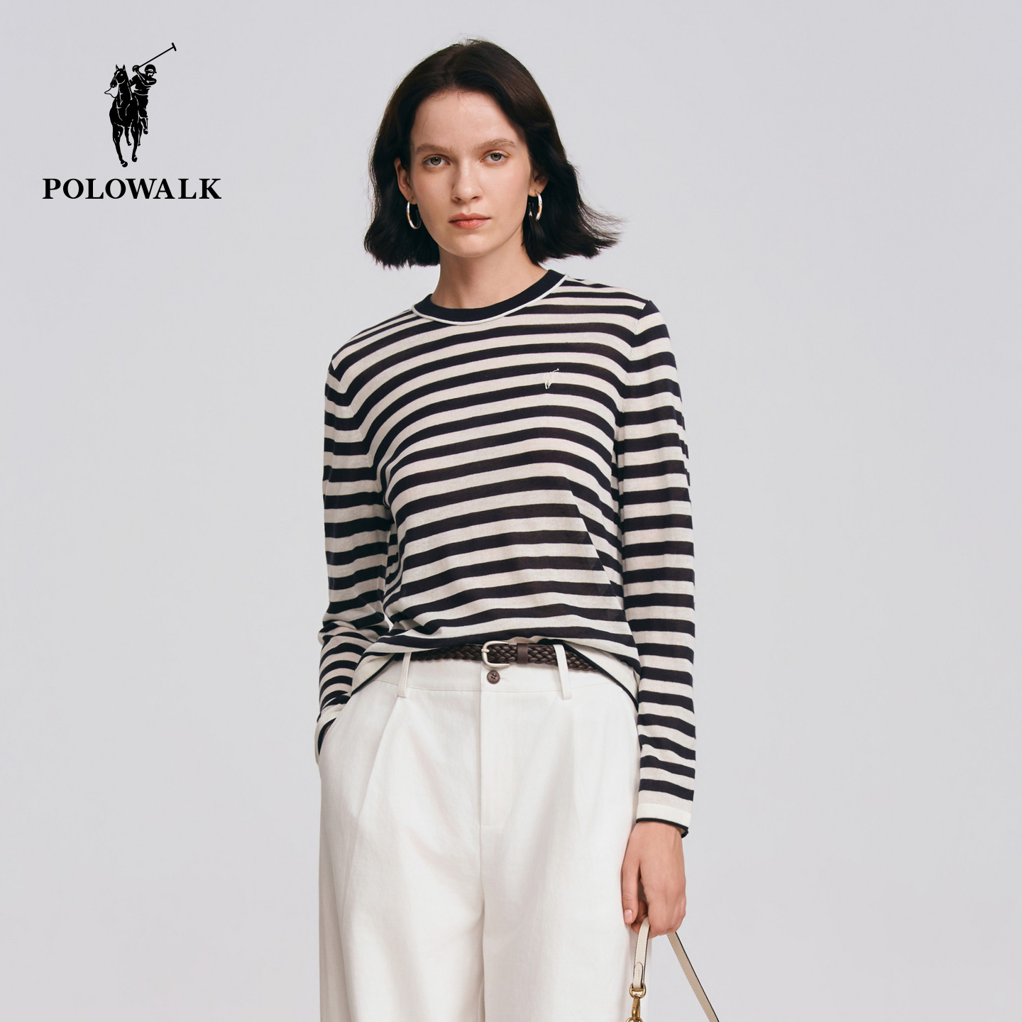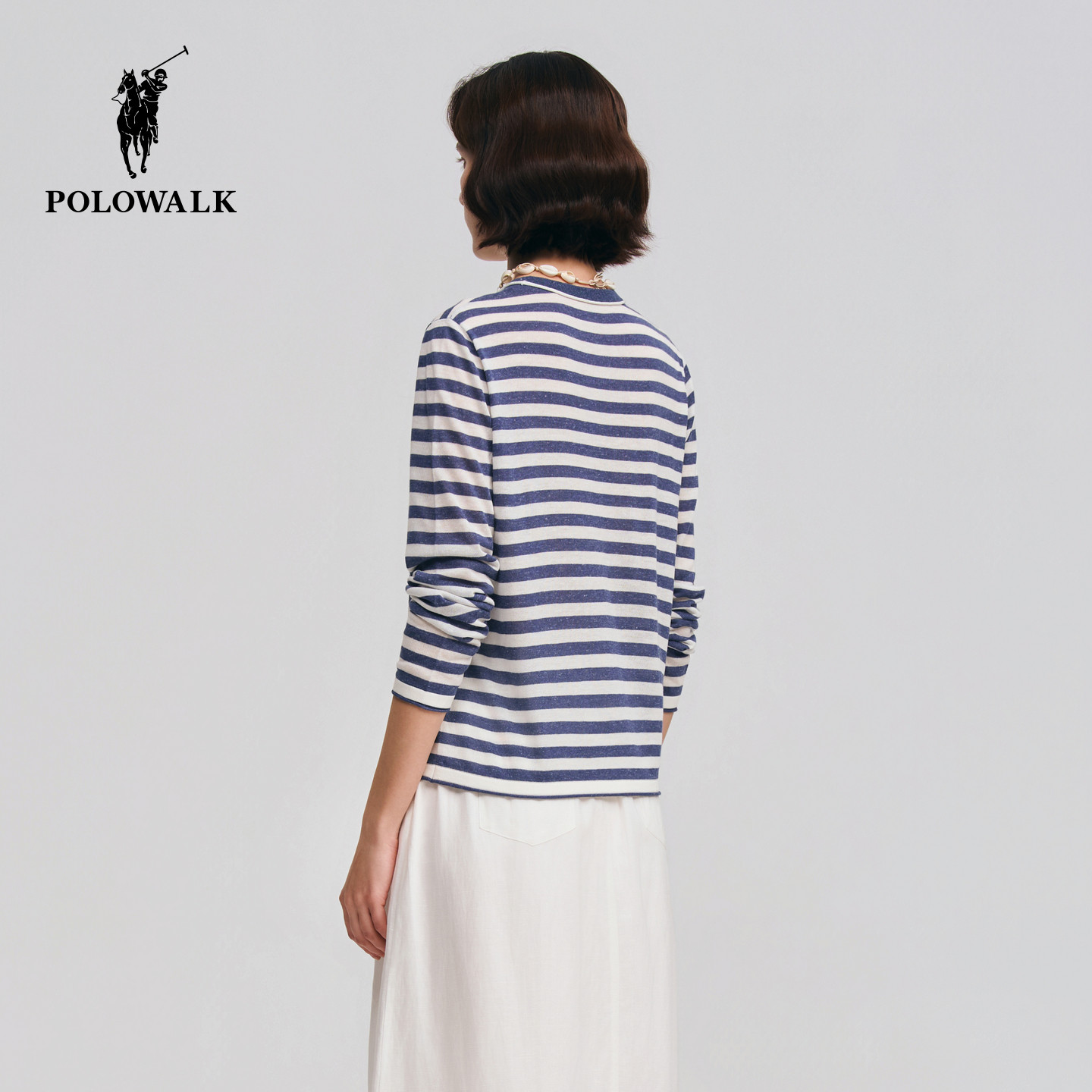 POLOWALK女式针织衫2026春季新品亚麻混纺圆领撞色条纹长袖针织衫