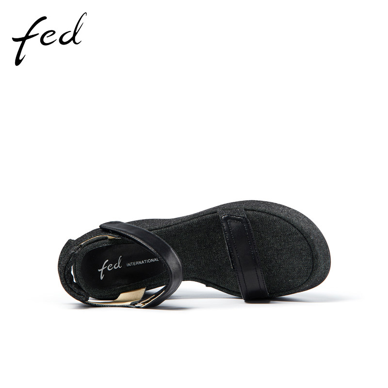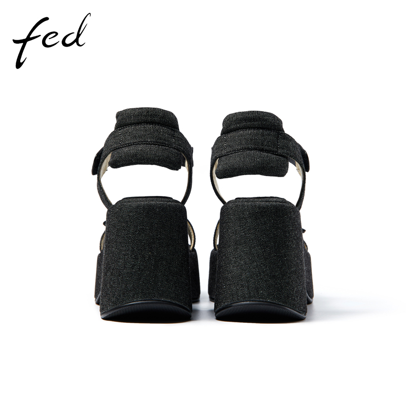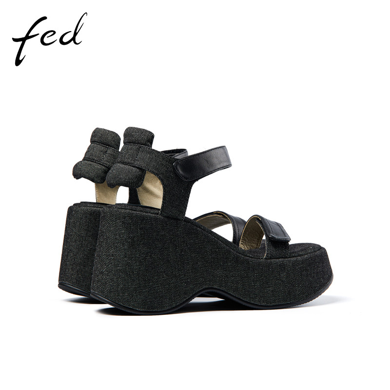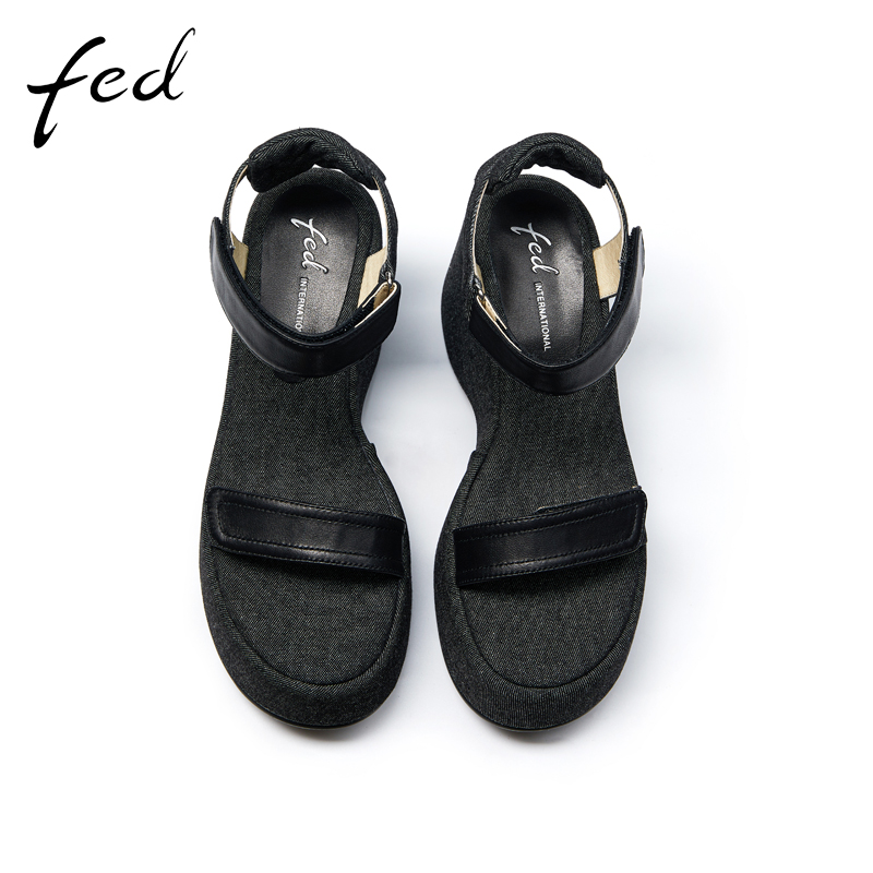 fed松糕粗跟凉鞋夏季新款女鞋黑色厚底增高坡跟凉鞋女R0624-YA022