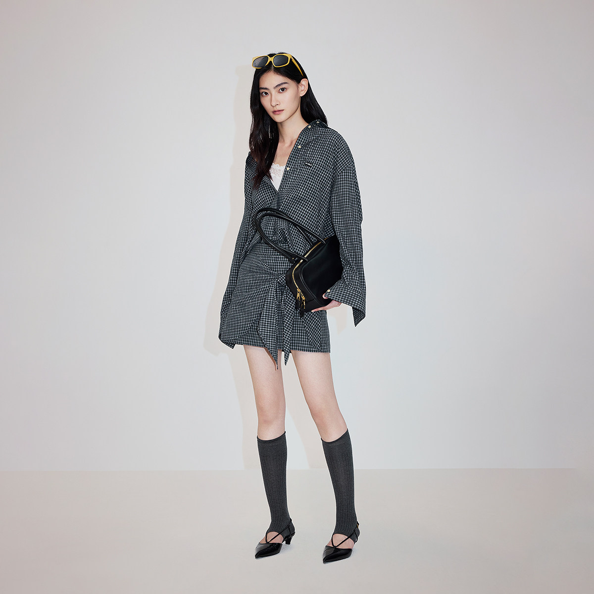 【新品】奚梦瑶同款欧时力 衬衫2026春精梳棉复古格子中长款宽松