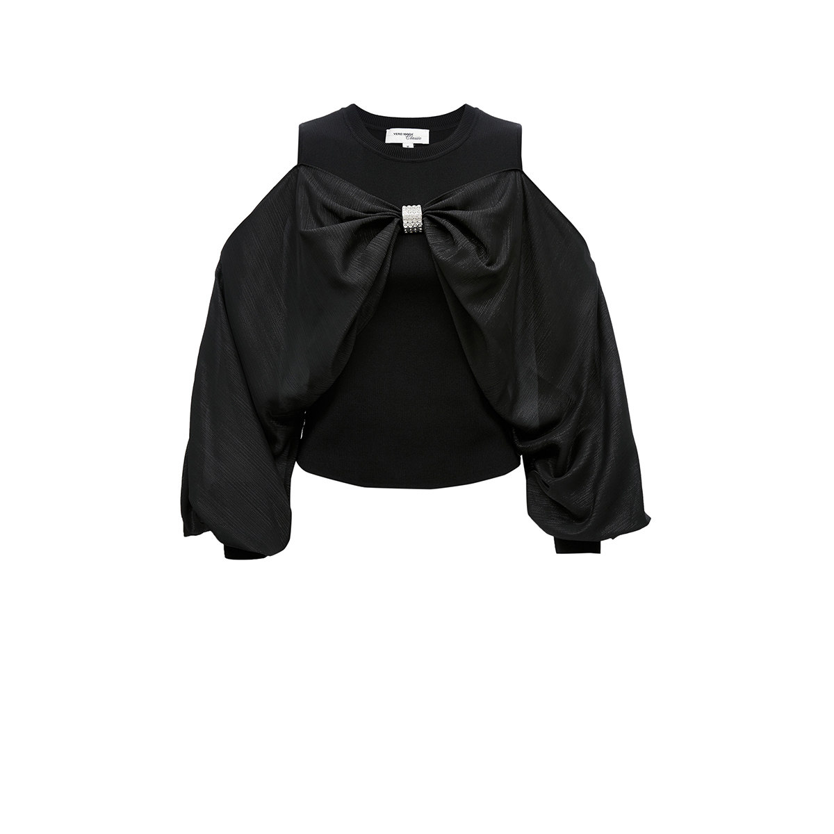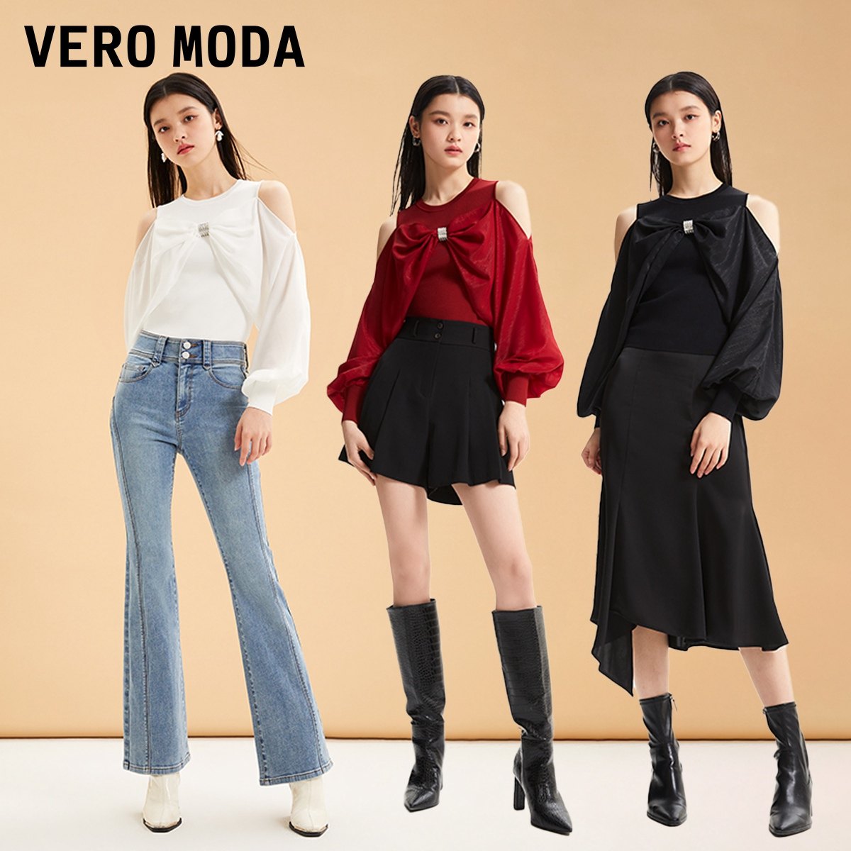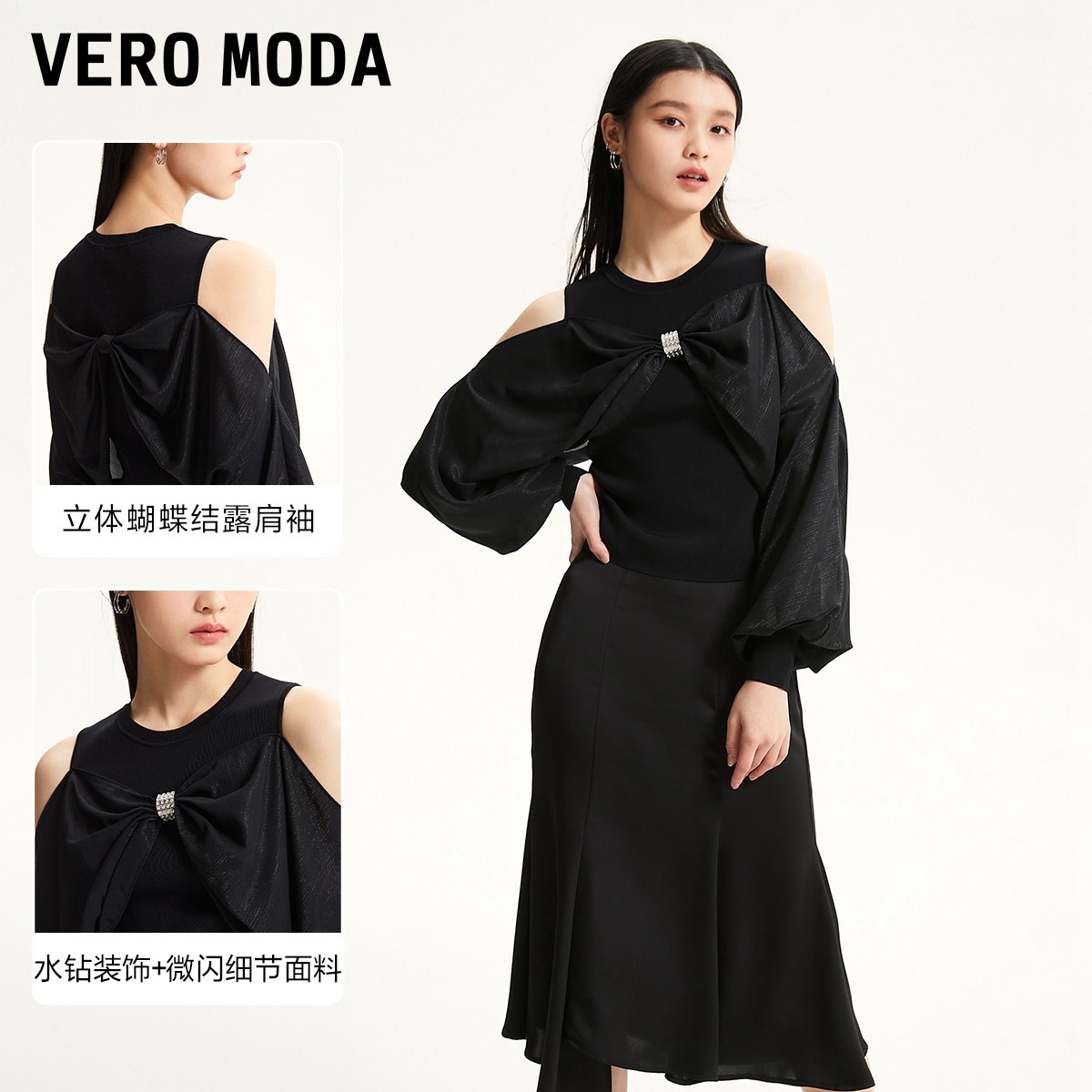 tq区绫致Vero Moda针织衫女秋冬甜美立体蝴蝶结露肩上衣