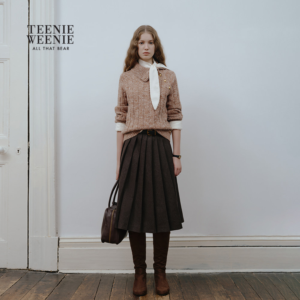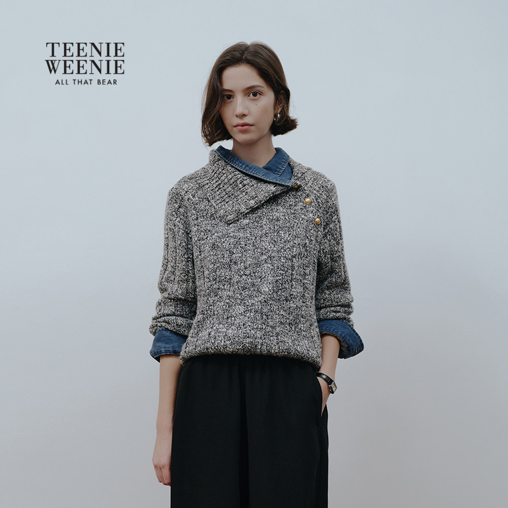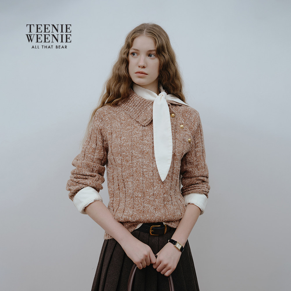 TeenieWeenie小熊女装含绵羊毛针织衫2025冬季新款花纱斜翻领毛衣