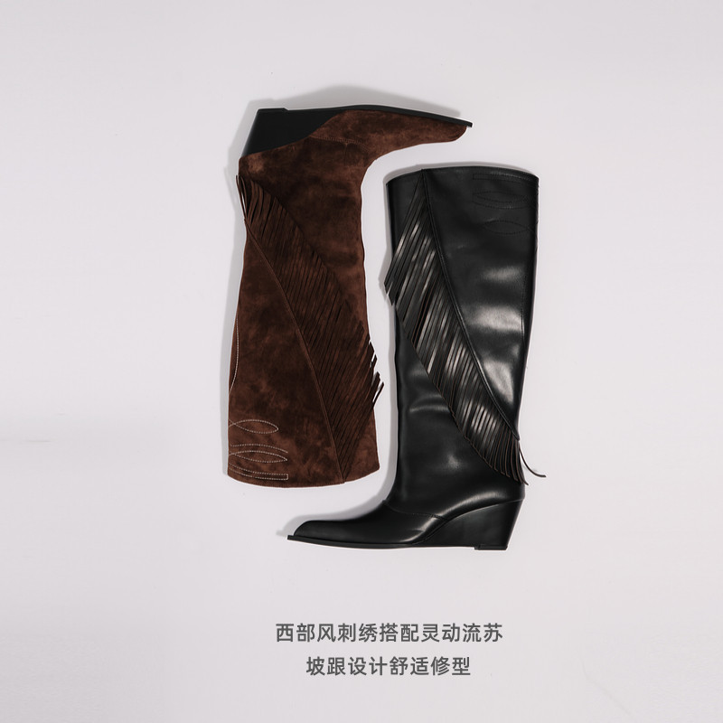王艺瑾同款lost in echo2025冬季新款波西米亚尖头流苏坡跟长筒靴