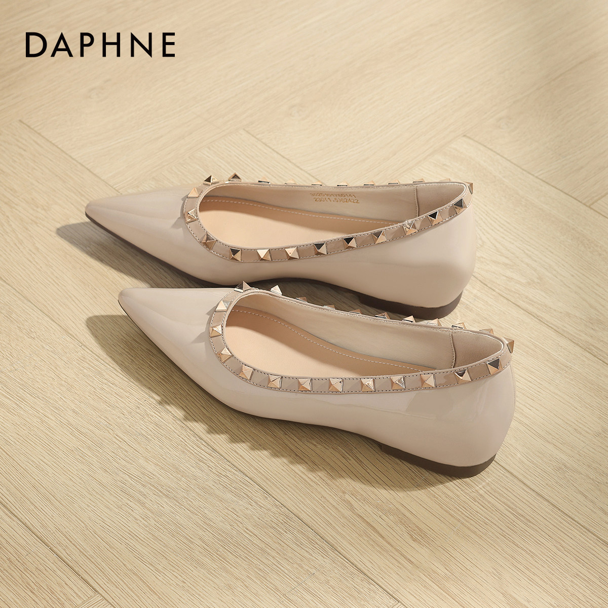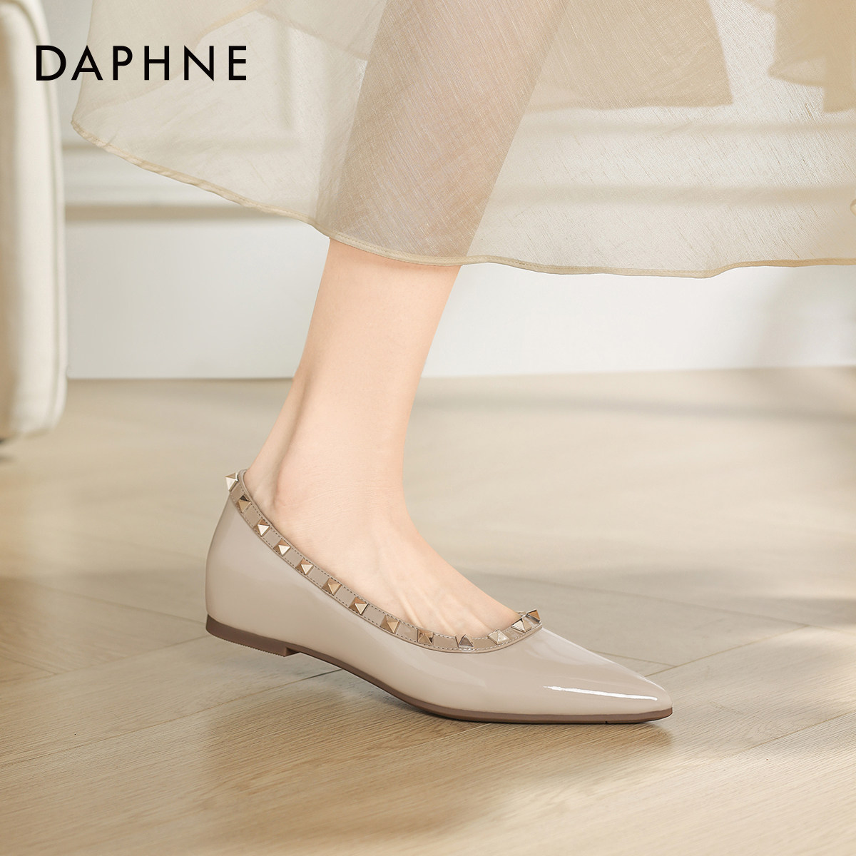 达芙妮尖头裸色浅口女单鞋2026春季铆钉平底鞋绝美不累脚法式皮鞋