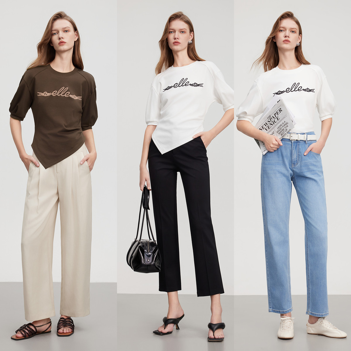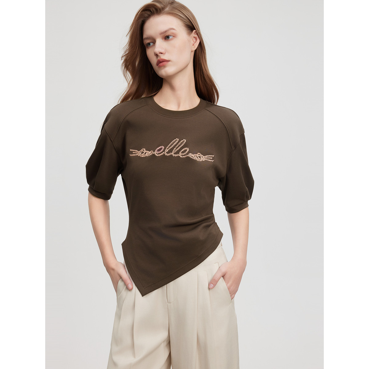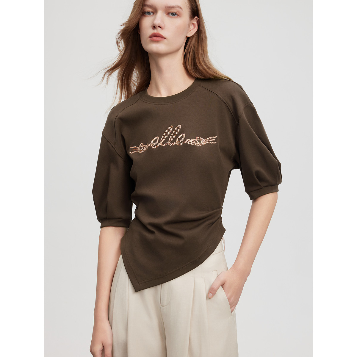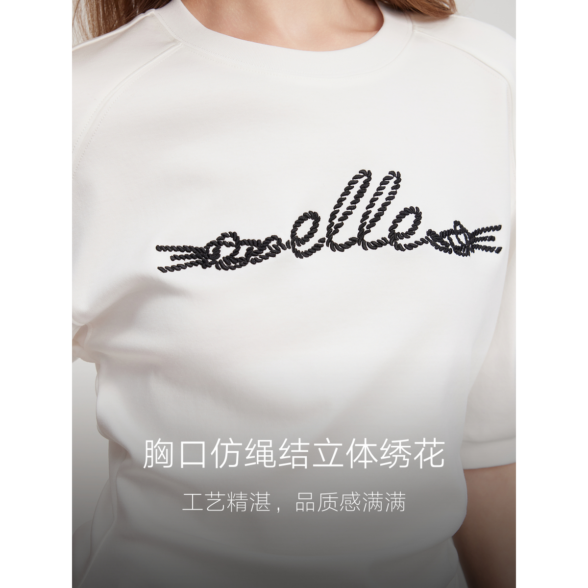 ELLE法式打褶收腰短袖女2025夏新款纯棉圆领不规则设计感上衣T恤