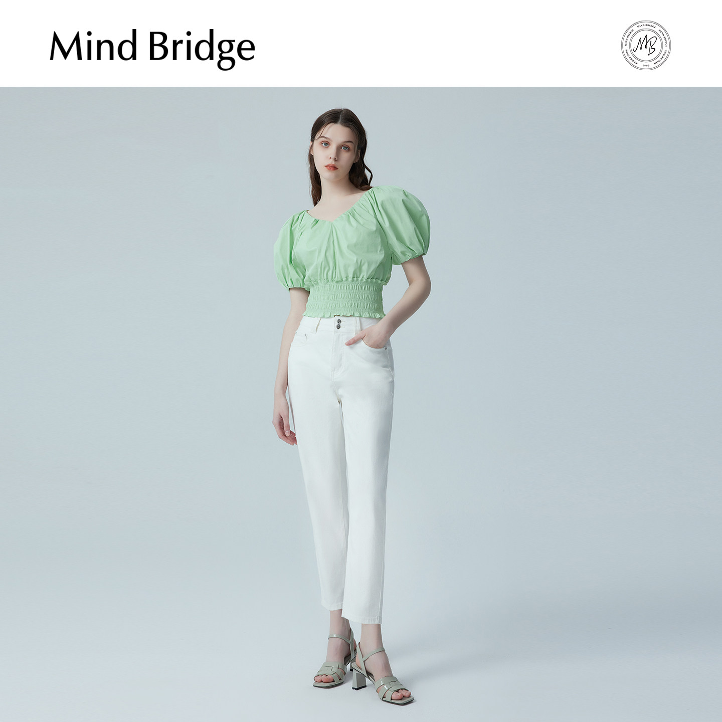 MB MindBridge女士V领泡泡袖衬衫夏季显瘦短款上衣设计感收腰短袖