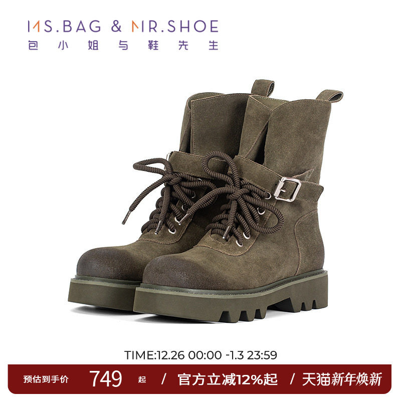 包小姐与鞋先生2025年冬季新品苔藓绿擦色工艺厚底马丁靴女254029