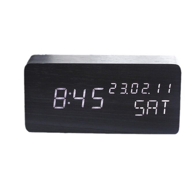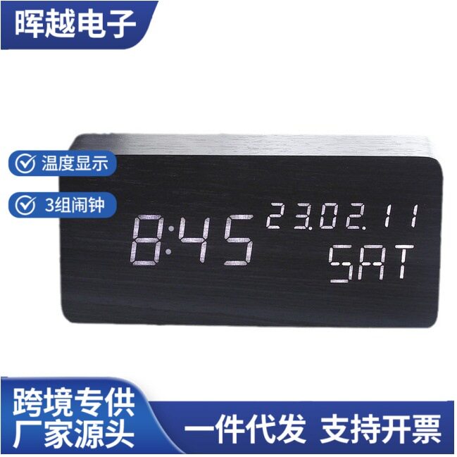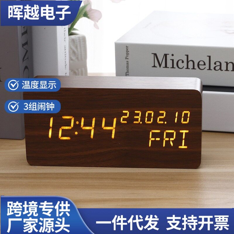 同屏三显LED电子木头闹钟 万年历时钟床头静音夜光座钟木质钟表