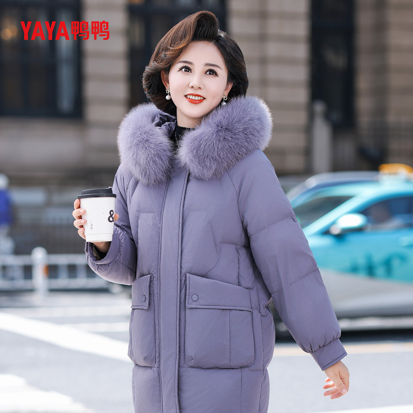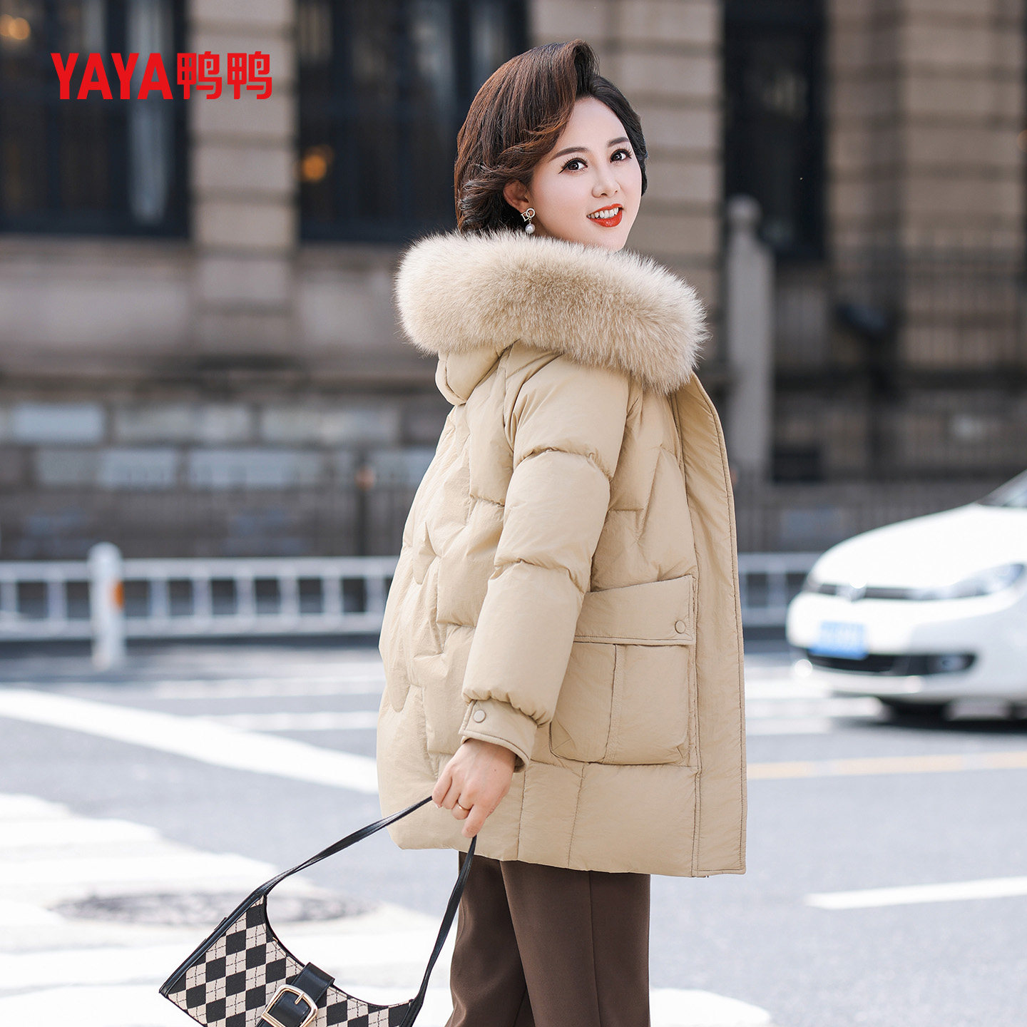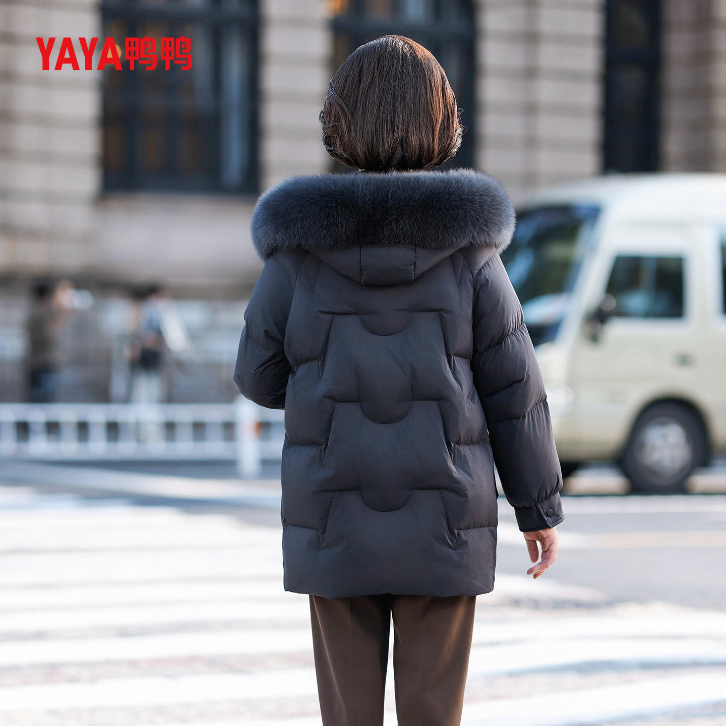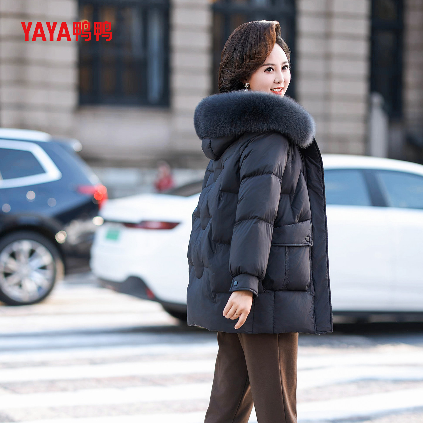 YAYA鸭鸭中年妈妈羽绒服女中长款冬季狐狸毛领连帽冬装中老年外套