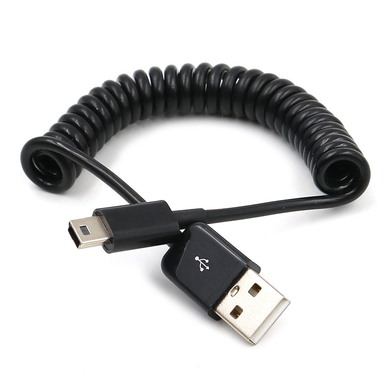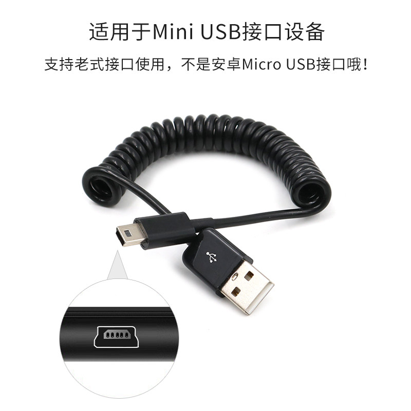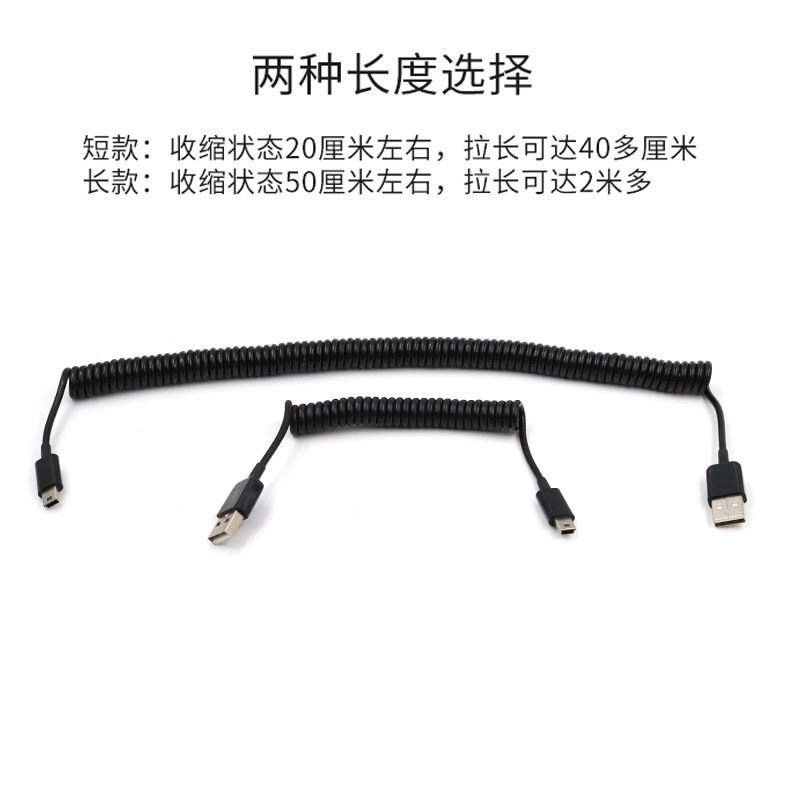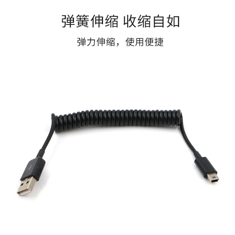 Mini USB接口弹簧伸缩数据线T型口移动硬盘平板相机车载导航行车记录仪老式迷你5pin螺旋充电线短款伸拉收缩