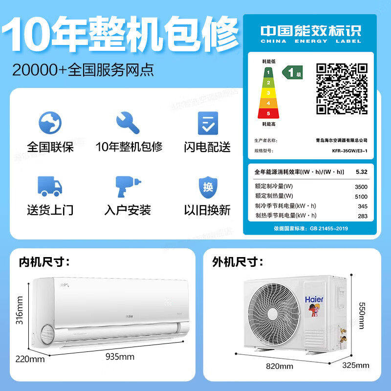 【镇店爆款】海尔空调净省电Plus1.5匹1匹家用官方新一级挂机35E1