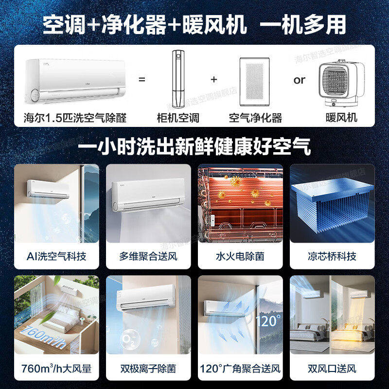 海尔洗空气1.5匹空调家用挂式变频一级能效挂机冷暖两用卧室除醛