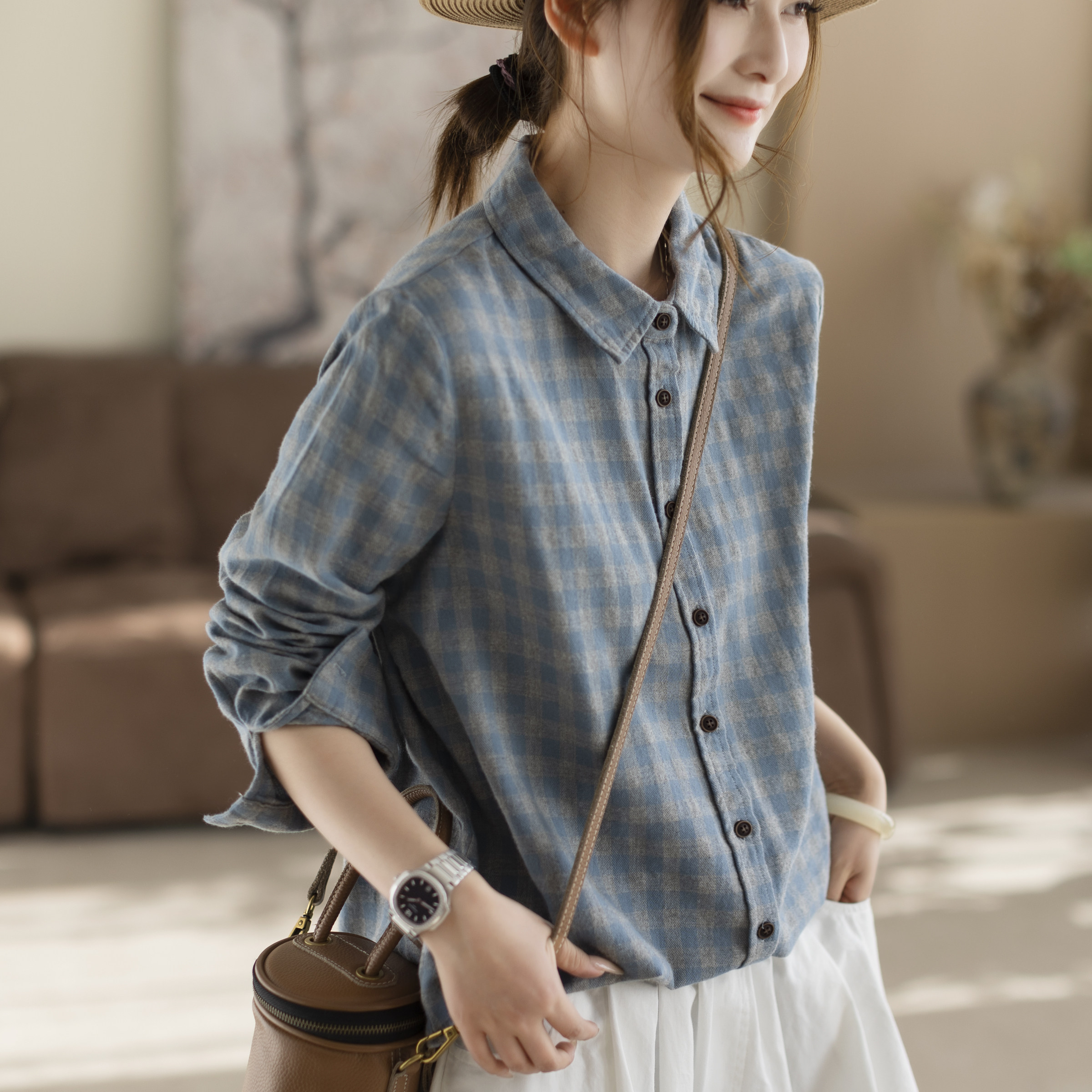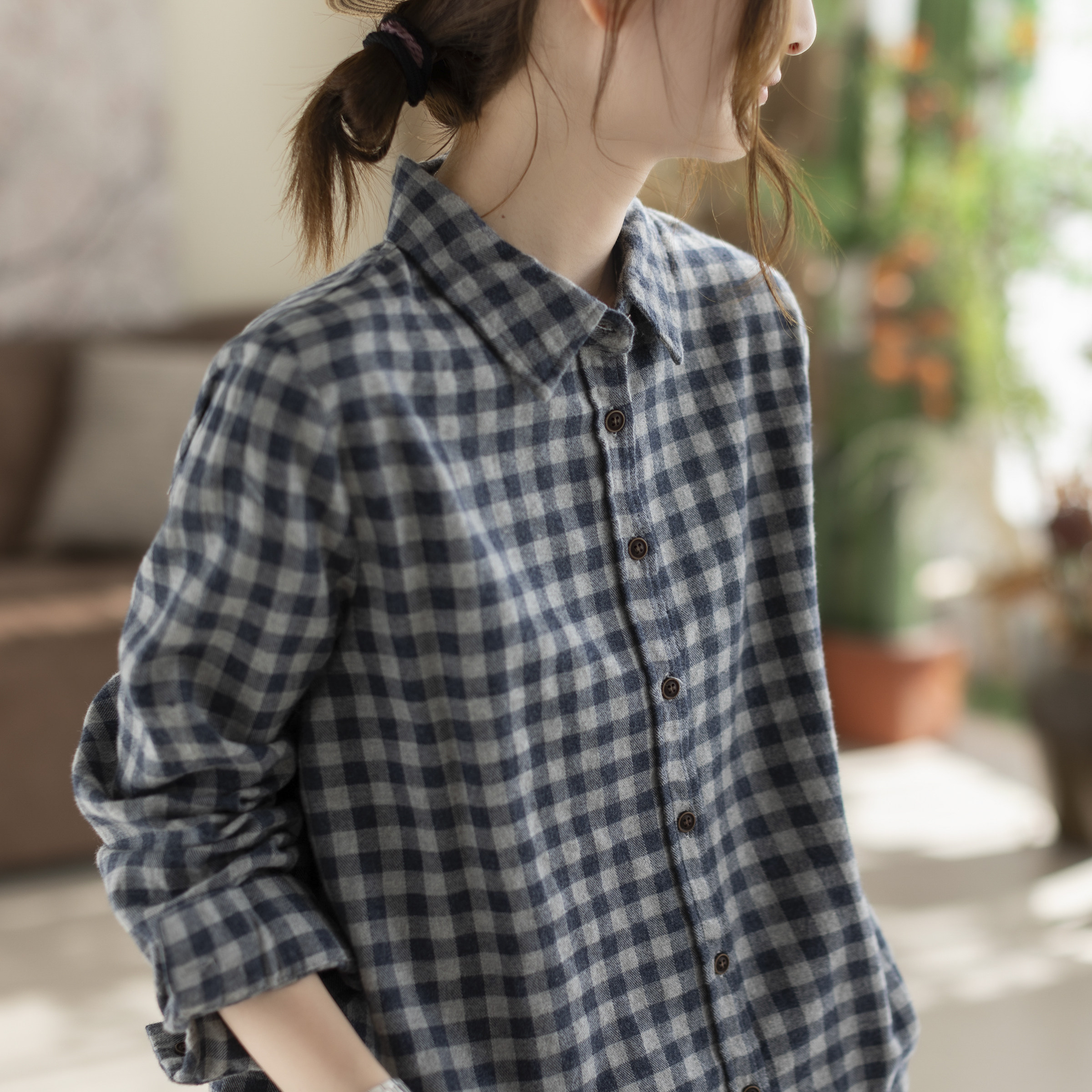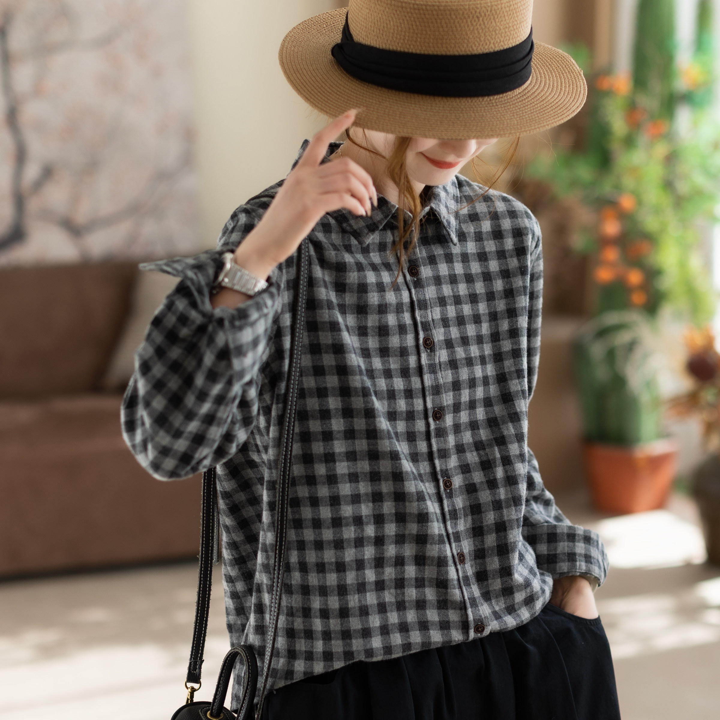 春季薄款复古格子长袖衬衫女宽松显瘦纯棉上衣方领休闲时尚衬衣女