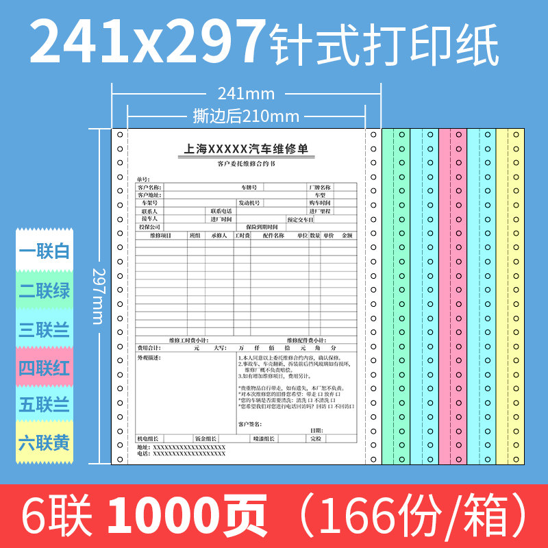 凌龙A4针式打印纸一二三四五联210x297mm彩色打印纸241x297mm针式a4带孔打印纸上海大众送货单六联多联打印纸
