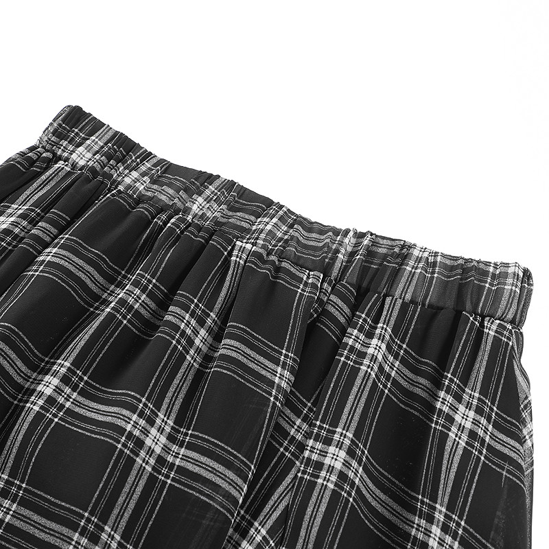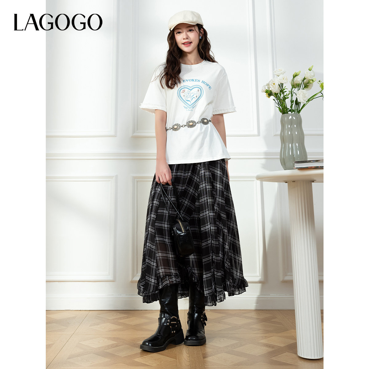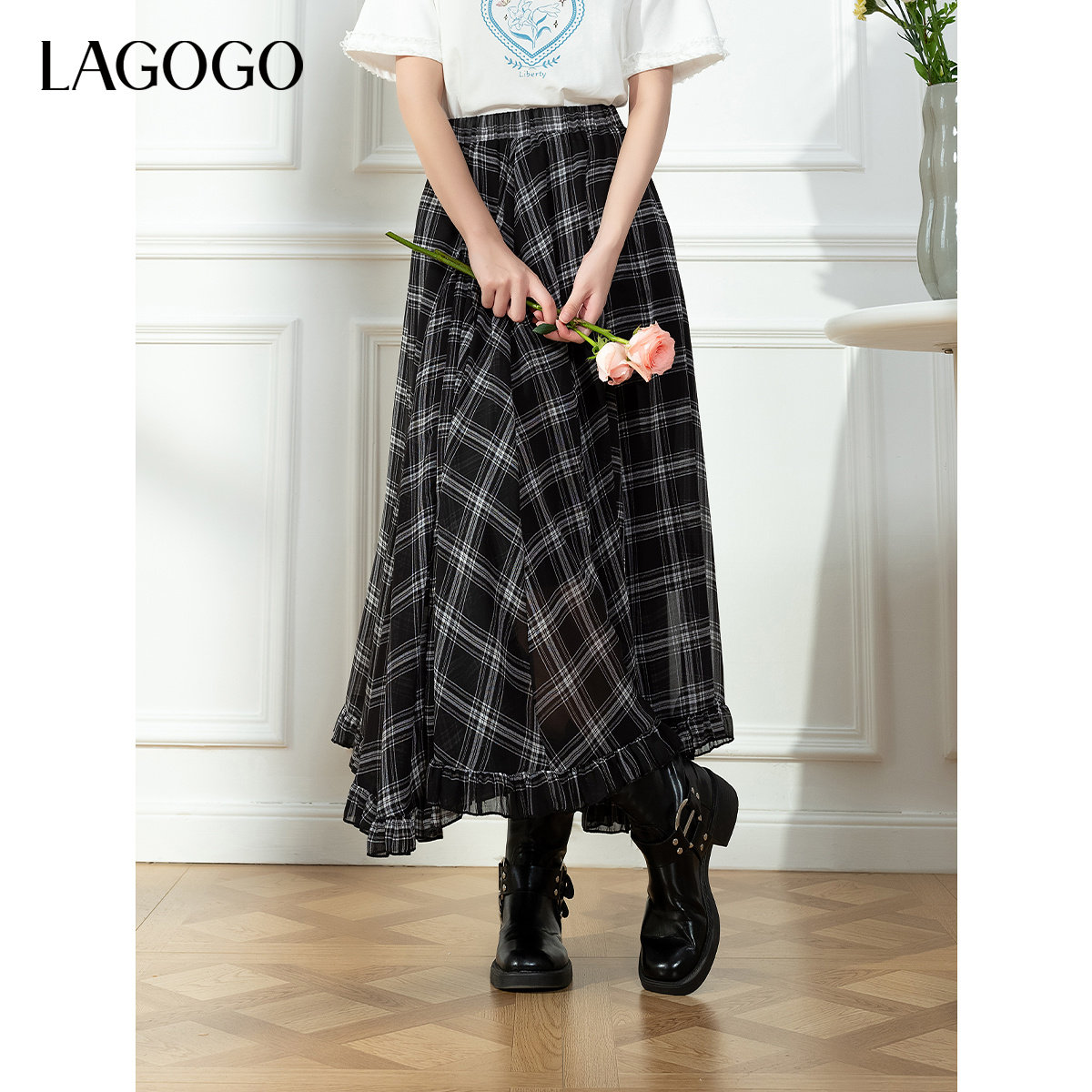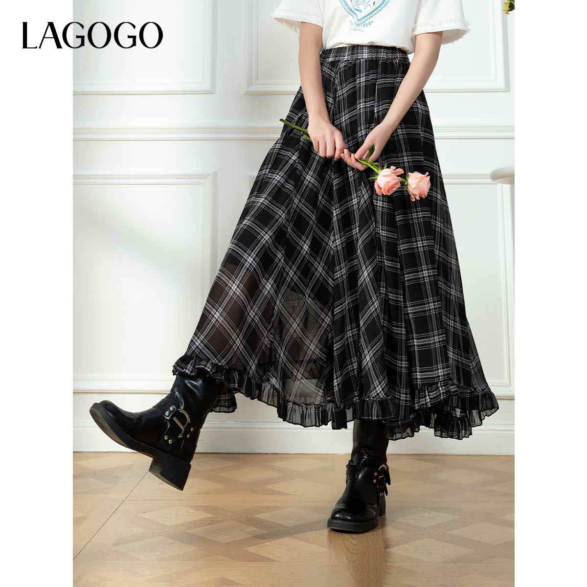 LAGOGO黑白格清新雪纺半身裙女拉谷谷2026春新款不规则垂感大摆裙