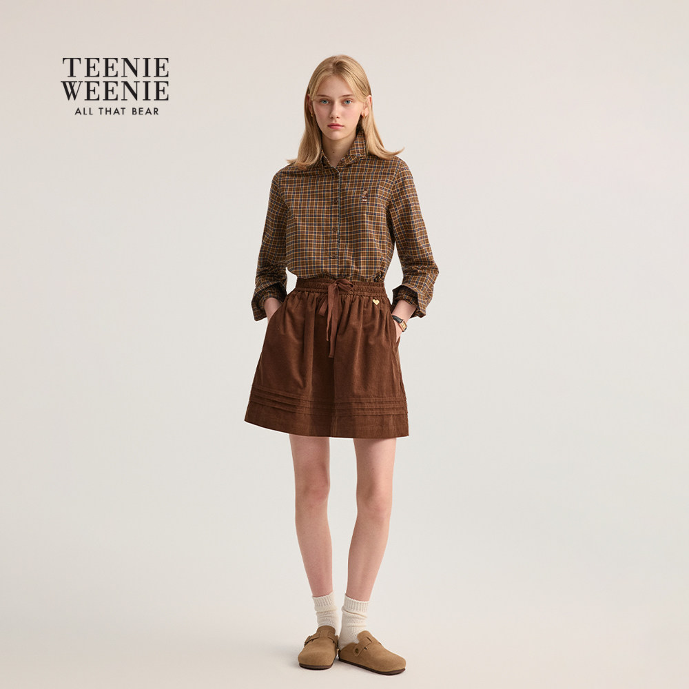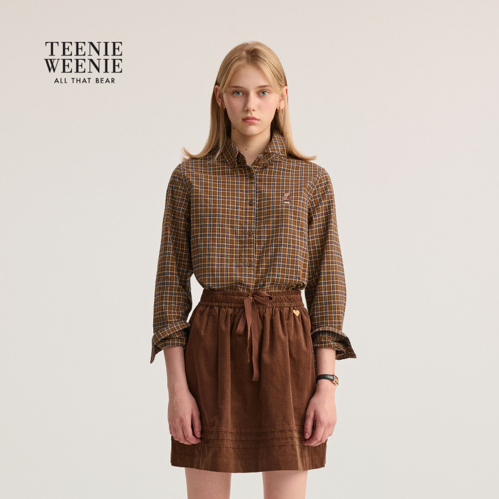 TeenieWeenie小熊女装2025秋新款舒适宽松知识分子风翻领格纹衬衫