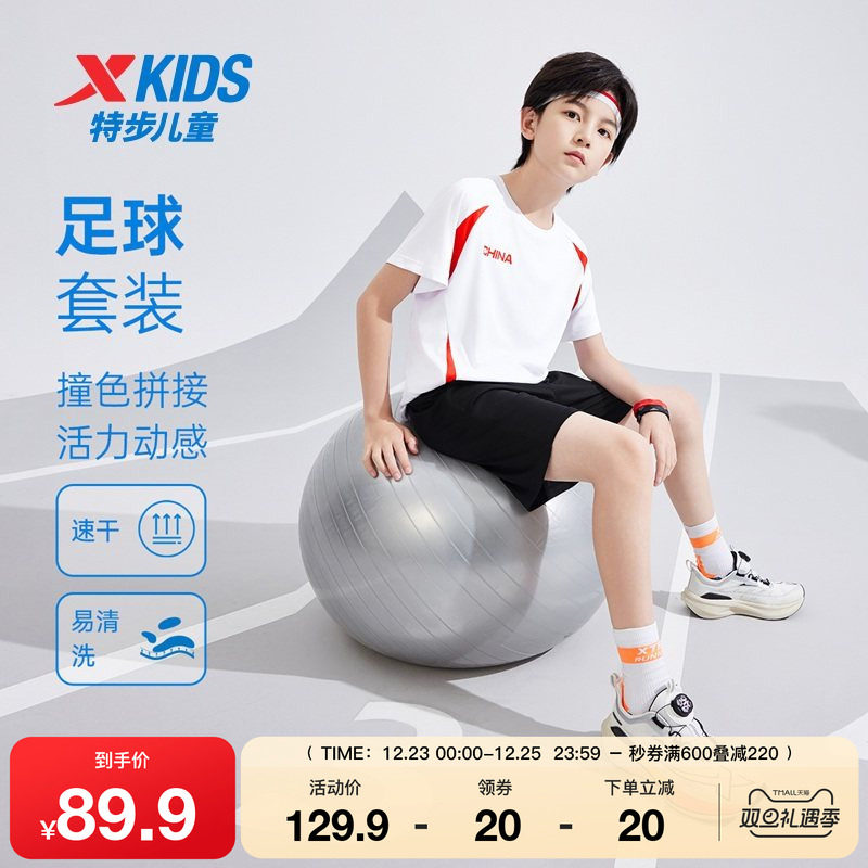 特步童装儿童套装夏季新款女童拼接短袖短裤两件套男童足球运动服