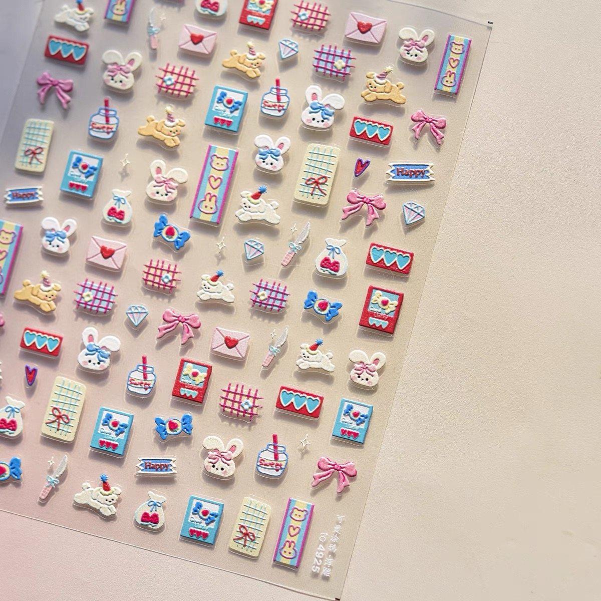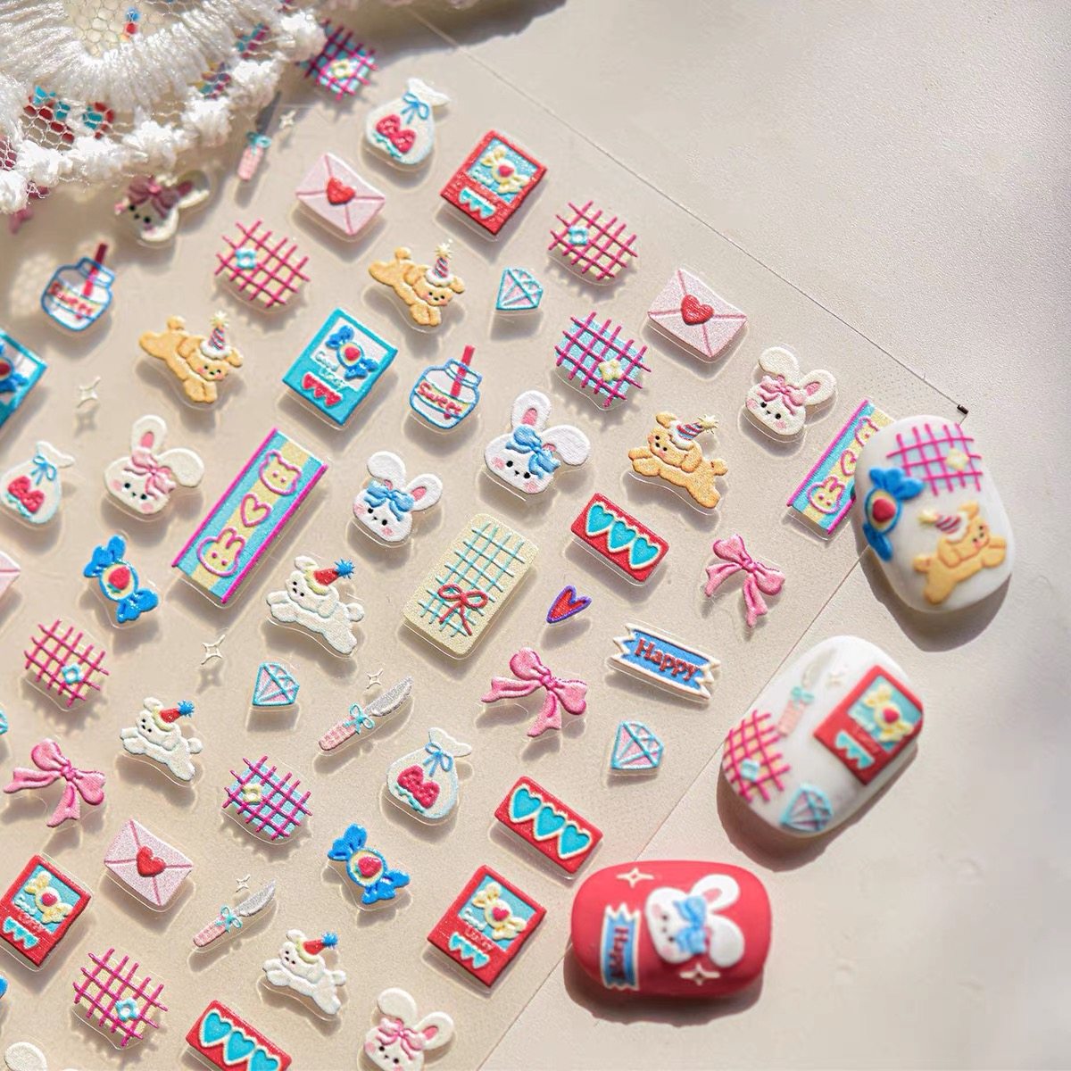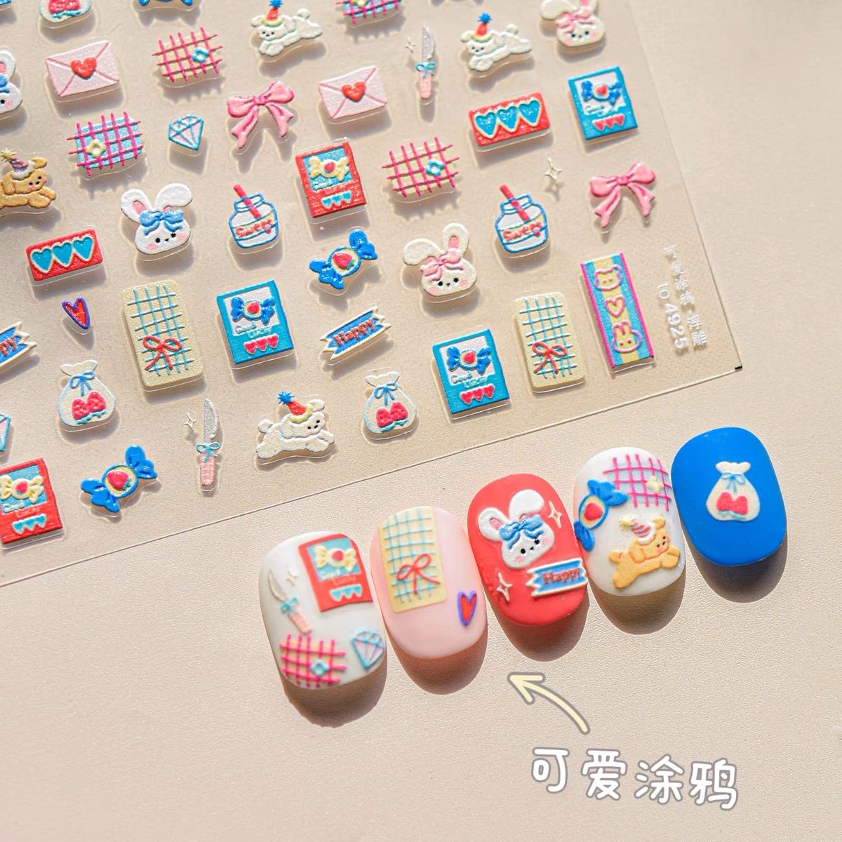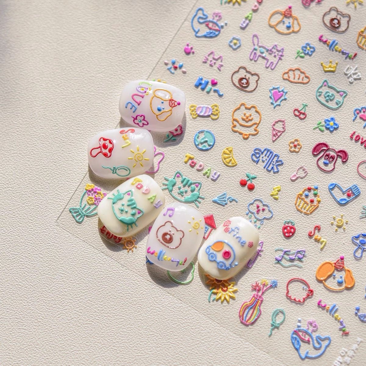 新款可爱涂鸦线条浮雕美甲贴纸小狗小兔花朵百搭多巴胺背胶指甲贴