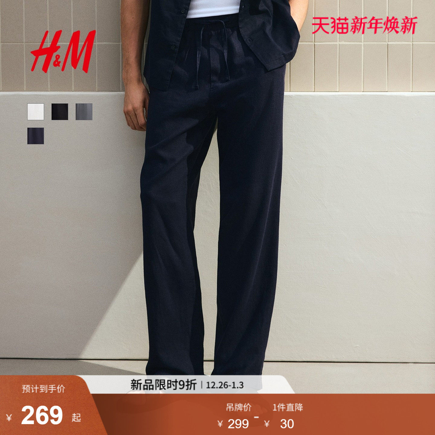 HM男装休闲裤2025冬季新款亚麻混纺直筒中腰宽松通勤长裤1261478