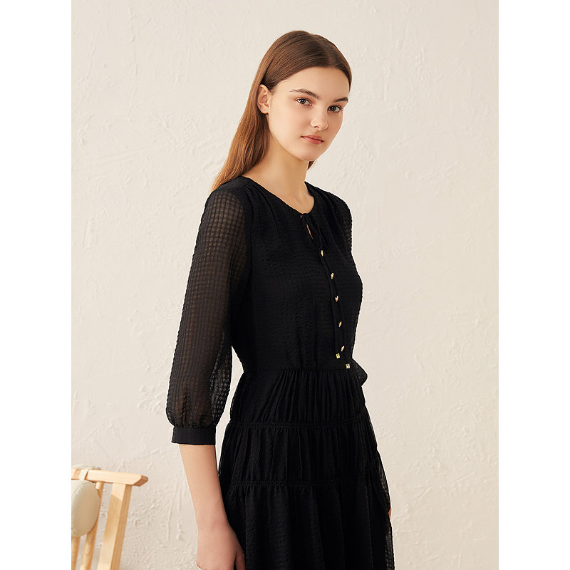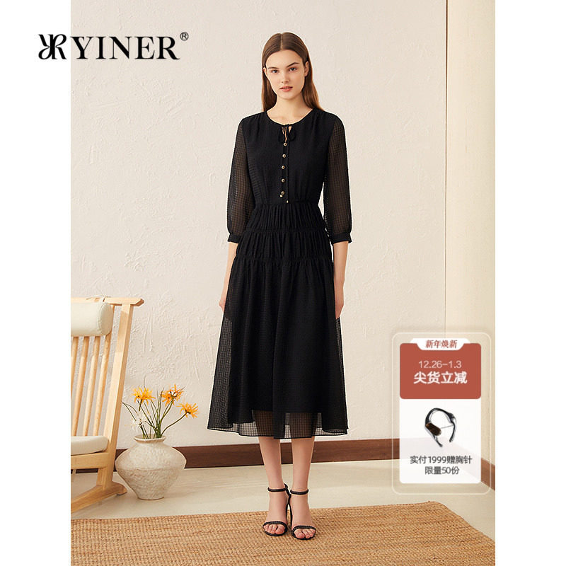 YINER音儿专选2025夏季新款法式飘带领华夫格泡泡纱蛋糕裙连衣裙