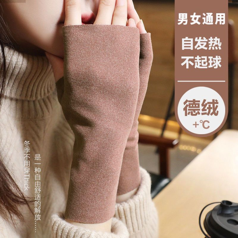 自发热德绒半指手套女秋冬季保暖防寒学生写字办公打字漏手指头