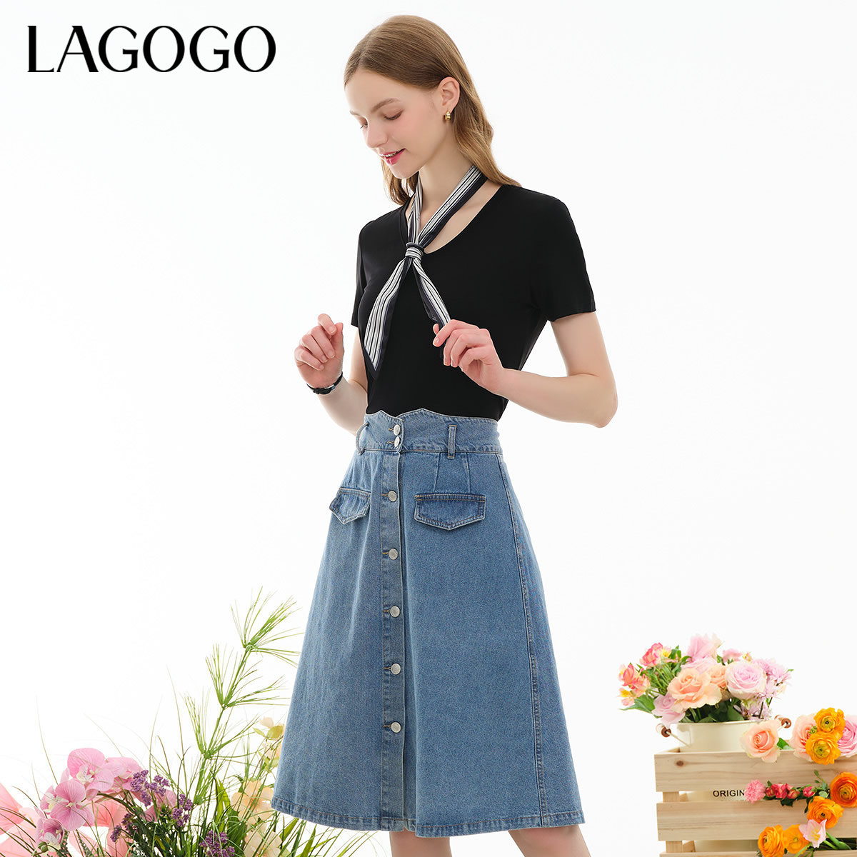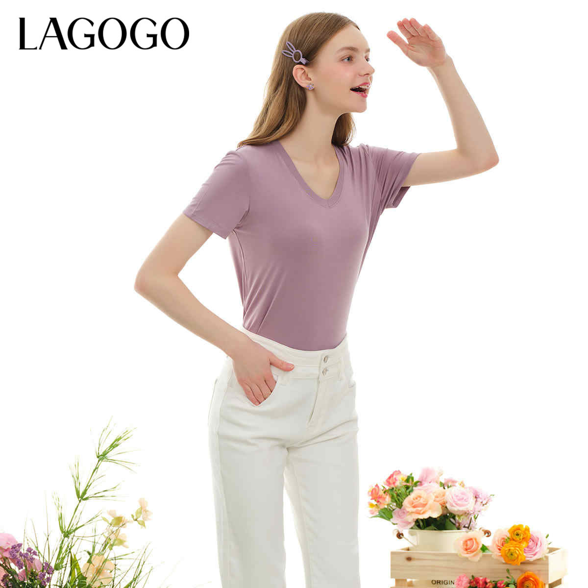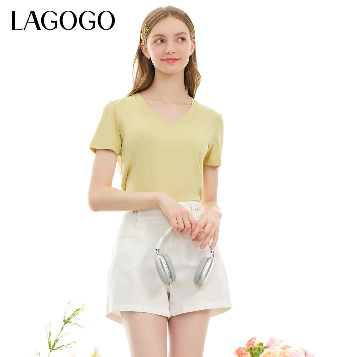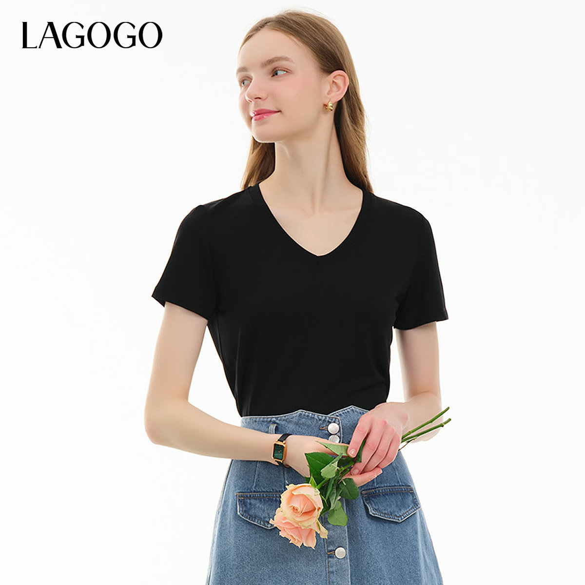 LAGOGO黑色法式V领垂顺T恤女拉谷谷夏季新款气质简约通勤短袖上衣